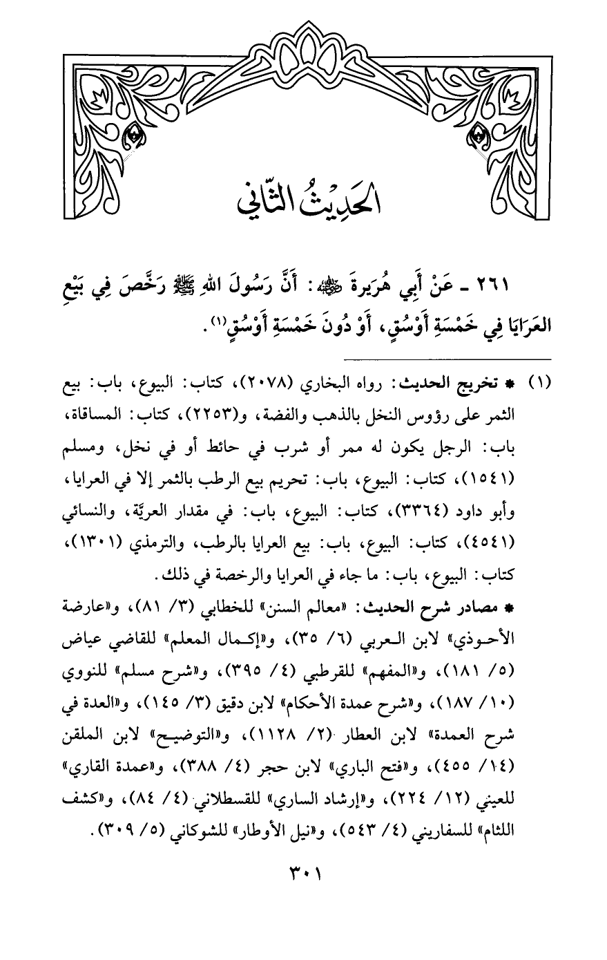 261 - عَنْ أَبِي هُرَيرةَ -رضي اللَّه عنه-: أَنَّ رَسُولَ اللَّهِ -صلى اللَّه عليه وسلم- رَخَّصَ فِي بَيْعِ العَرَايَا فِي خَمْسَةِ أَوْسُقٍ، أَوْ دُونَ خَمْسَةِ أَوْسُقٍ (¬1).