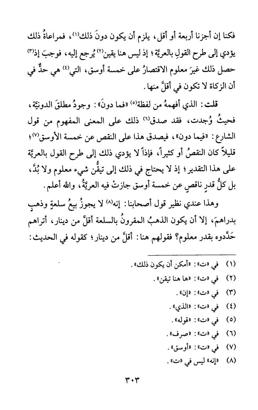 قلت: الذي أفهمهُ من لفظة (¬5) "فما دونَ": وجودُ مطلقَ الدونيَّة، فحيثُ وُجدت، فقد صدق (¬6) ذلك على المعنى المفهوم من قول الشارع: "فيما دون"، فيصدق هذا على النقص عن خمسة الأوسق (¬7)؛ قليلًا كان النقصُ أو كثيرًا، فإذًا لا يؤدِّي ذلك إلى طرح القول بالعريَّة على هذا التقدير؛ إذ لا يحتاج في ذلك إلى تيقُّن شيء معلوم ولا بُدَّ، بل كلُّ قدرٍ ناقصٍ عن خمسة أوسق جازتْ فيه العريَّةُ، واللَّه أعلم.