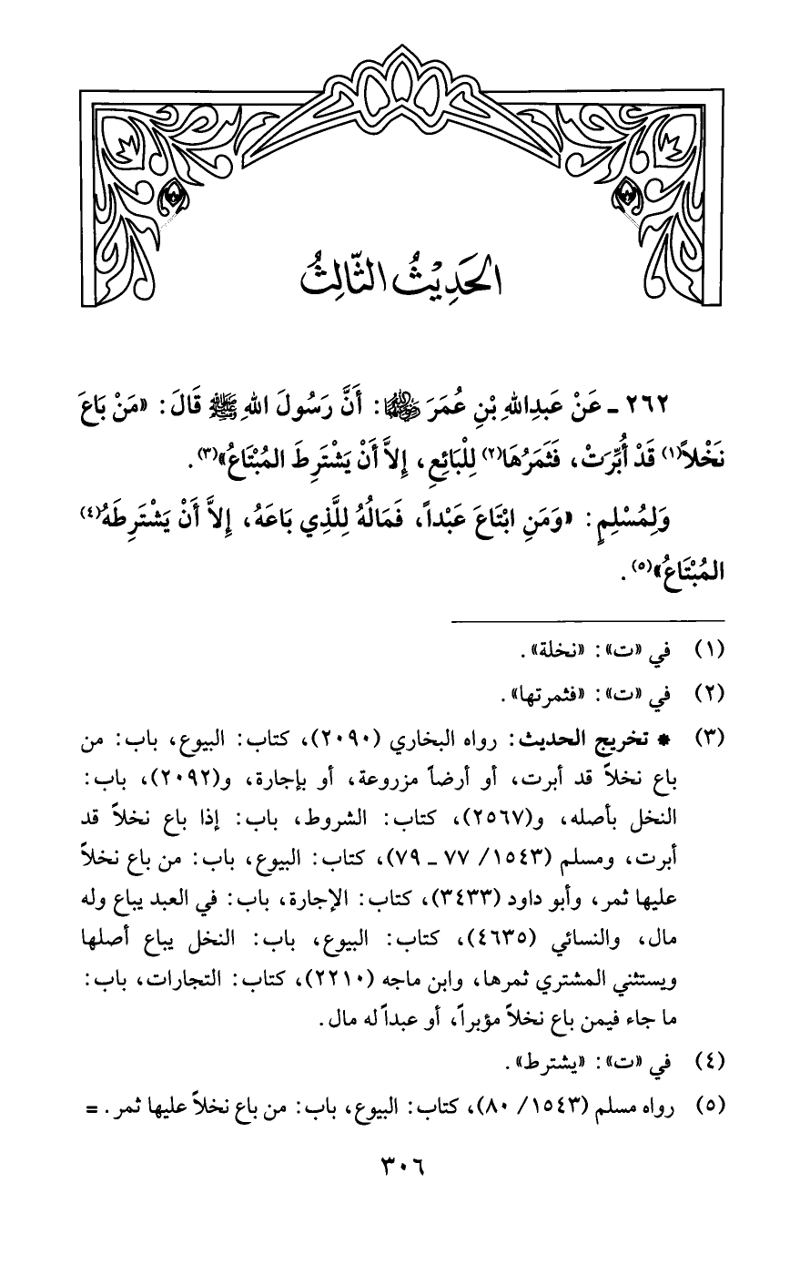 262 - عَنْ عَبدِ اللَّهِ بْنِ عُمَرَ -رضي اللَّه عنهما-: أَنَّ رَسُولَ اللَّهِ -صلى اللَّه عليه وسلم- قَالَ: "مَنْ بَاعَ نَخْلًا (¬1) قَدْ أُبِّرَتْ، فَثَمَرُهَا (¬2) لِلْبَائِعِ، إِلَّا أَنْ يَشْتَرِطَ المُبْتَاعُ" (¬3).
