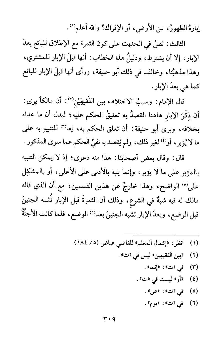 قال: وقال بعض أصحابنا: هذا منه دعوى؛ إذ لا يمكن التنبيه بالمؤبر على ما لا يؤبر، وإنما ينبه بالأدنى على الأعلى، أو بالمشكِل على (¬5) الواضح، وهذا خارجٌ عن هذين القسمين، مع أن الذي قاله مالك له فيه شبهٌ في الشرعِ، وذلك أن الثمرةَ قبل الإبار تُشبه الجنينَ قبل الوضع، وبعدَ الإبار تشبه الجنينَ بعد (¬6) الوضع، فلما كانت الأجنَّةُ