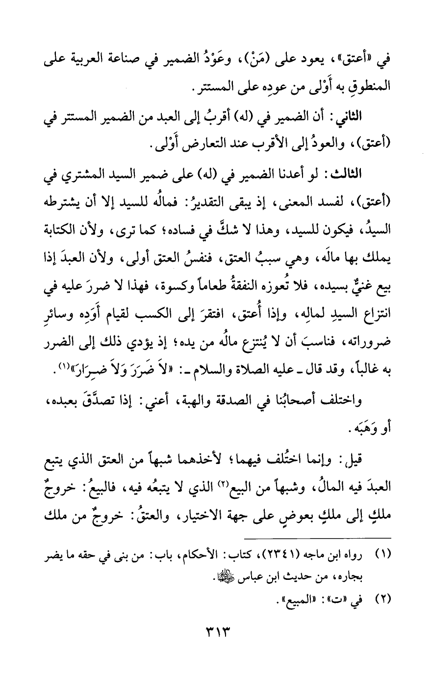 الثالث: لو أعدنا الضمير في (له) على ضمير السَّيِّد المشتري في (أعتق)، لفسد المعنى، إذ يبقى التقديرُ: فمالُه للسيد إِلَّا أن يشترطه السيدُ، فيكون للسيد، وهذا لا شكَّ في فساده؛ كما ترى، ولأن الكتابة يملك بها مالَه، وهي سببُ العتق، فنفسُ العتق أولى، ولأن العبدَ إذا بيع غنيٌّ بسيده، فلا تُعوزه النفقةُ طعامًا وكسوة، فهذا لا ضررَ عليه في انتزاع السيدِ لمالِه، وإذا أُعتق، افتقرَ إلى الكسب لقيام أَوَدِه وسائرِ ضروراته، فنالسبَ أن لا يُنتزع مالُه من يده؛ إذ يؤدِّي ذلك إلى الضرر به غالبًا، وقد قال -عليه الصلاة والسلام-: "لَا ضَرَرَ وَلَا ضِرَارَ" (¬1).