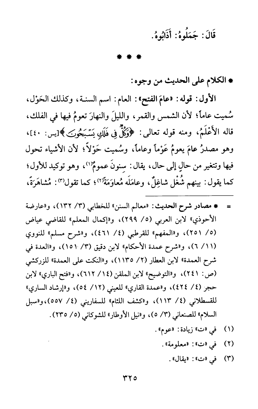 الأول: قوله: "عامَ الفتح": العام: اسم السنة، وكذلك الحَوْل، سُميت عامًا؛ لأن الشمس والقمر، والليلَ والنهارَ تعومُ فيها في الفلك، قاله الأَعْلَمُ، ومنه قوله تعالى: {وَكُلٌّ فِي فَلَكٍ يَسْبَحُونَ} [يس: 40]، وهو مصدرُ عامَ يعومُ عَوْمًا وعامًا، وسُميت حَوْلًا؛ لأن الأشياء تحول فيها وتتغير من حالٍ إلى حال، يقال: سِنونَ عمومٌ (¬1)، وهو توكيد للأول؛ كما يقول: بينهم شُغْل شاغِلٌ، وعامَلَه مُعاوَمَةً (¬2)؛ كما تقول (¬3): مُشاهَرَةً،
