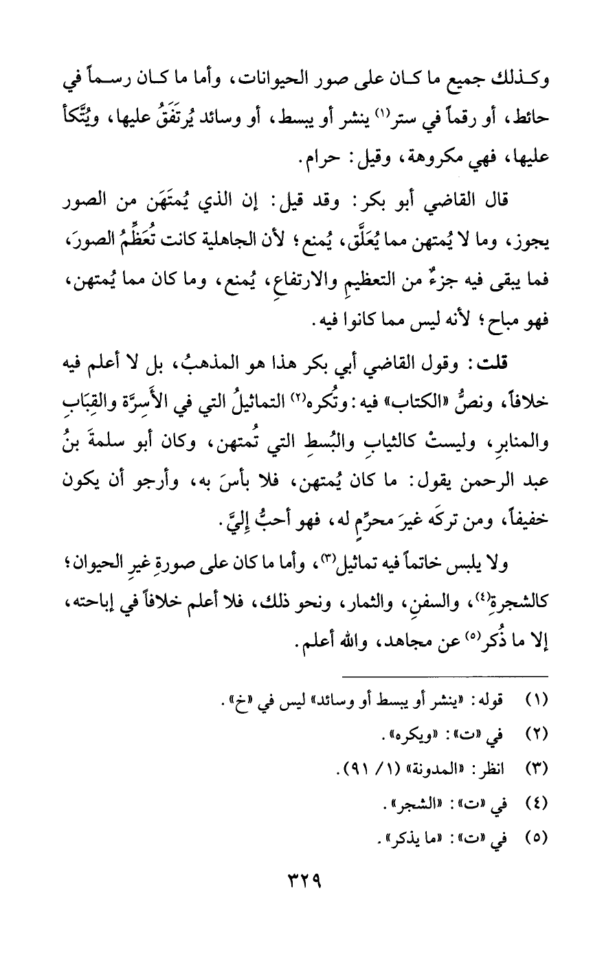 قلت: وقول القاضي أبي بكر هذا هو المذهبُ، بل لا أعلم فيه خلافًا، ونصُّ "الكتاب" فيه: وتُكره (¬2) التماثيلُ التي في الأَسِرَّة والقِبَابِ والمنابرِ، وليست كالثيابِ والبُسطِ التي تُمتهن، وكان أبو سلمةَ بنُ عبد الرحمن يقول: ما كان يُمتهن، فلا بأسَ به، وأرجو أن يكون خفيفًا، ومن تركَه غيرَ محرِّمٍ له، فهو أحبُّ إِليَّ.