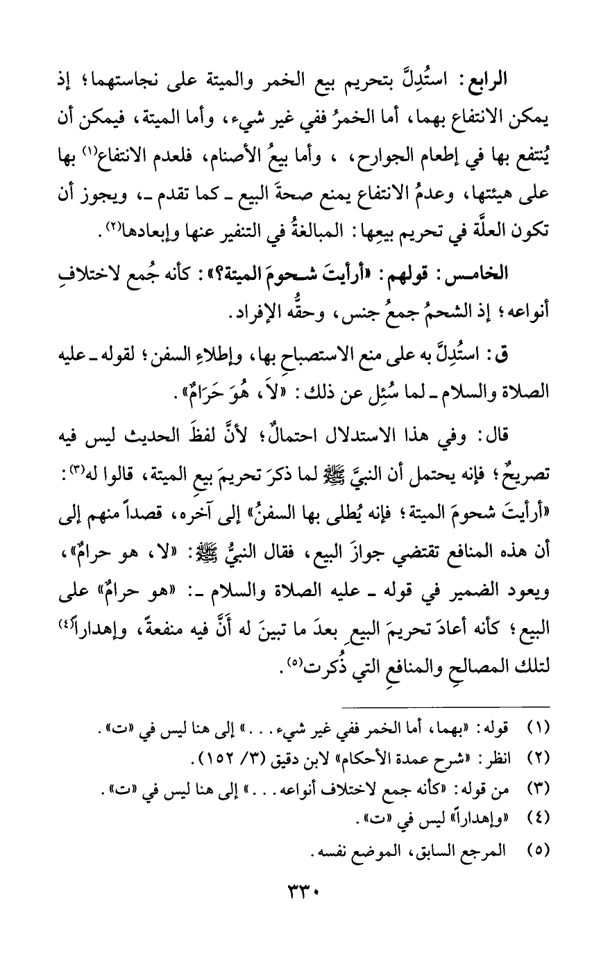 الرابع: استُدِلَّ بتحريم بيع الخمر والميتة على نجاستهما؛ إذ يمكن الانتفاع بهما، أما الخمرُ ففي غير شيء، وأما الميتة، فيمكن أن يُنتفع بها في إطعام الجوارح، وأما بيعُ الأصنام، فلعدم الانتفاع (¬1) بها على هيئتها، وعدمُ الانتفاع يمنع صحةَ البيع -كما تقدم-، ويجوز أن تكون العلَّة في تحريم بيعِها: المبالغةُ في التنفير عنها وإبعادها (¬2).