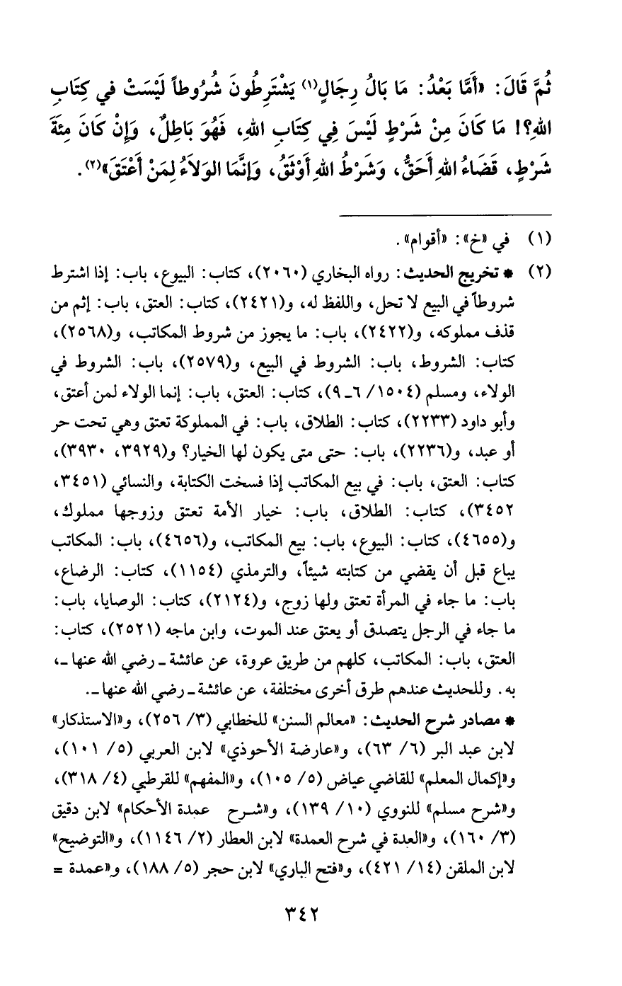 ثُمَّ قَالَ: "أَمَّا بَعْدُ: مَا بَالُ رِجَالٍ (¬1) يَشْتَرِطُونَ شُرُوطًا لَيْسَتْ في كِتَابِ اللَّهِ؟! مَا كَانَ مِنْ شَرْطٍ لَيْسَ فِي كتَابِ اللَّهِ، فَهُوَ بَاطلٌ، وإنْ كَانَ مِئَةَ شَرْطٍ، قَضَاءُ اللَّهِ أَحَقُّ، وَشَرْطُ اللَّهِ أَوْثَقُ، وَإِنَّمَا الوَلَاءُ لِمَنْ أَعْتَقَ" (¬2).