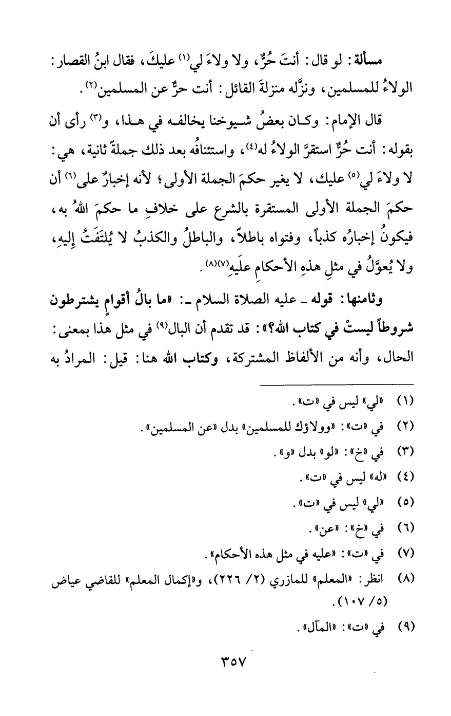 وثامنها: قوله -عليه الصلاة السلام-: "ما بالُ أقوامٍ يشترطون شروطًا ليستْ فى كتاب اللَّه؟ ": قد تقدم أن البال (¬9) في مثل هذا بمعنى: الحال، وأنه من الألفاظ المشتركة، وكتاب اللَّه هنا: قيل: المرادُ به