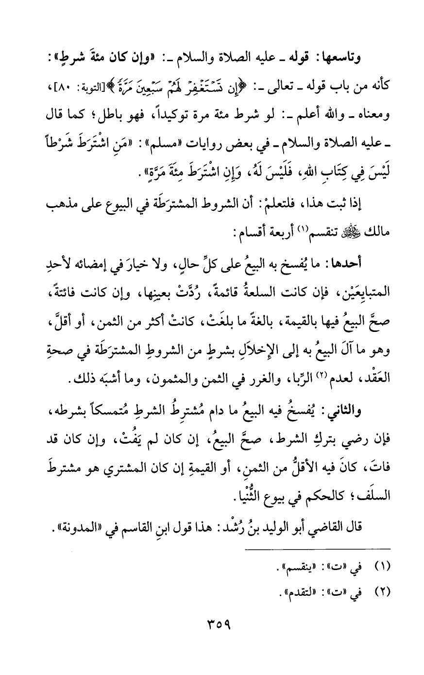 إذا ثبت هذا، فلتعلمْ: أن الشروط المشترَطَة في البيوع على مذهب مالك رحمه اللَّه تعالي تنقسم (¬1) أربعة أقسام: