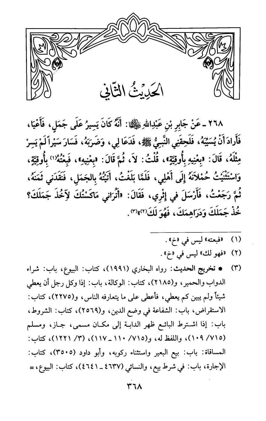 268 - عَنْ جَابِرِ بْنِ عَبْدِ اللَّهِ -رضي اللَّه عنهما-: أَنَّه كَانَ يَسِيرُ عَلَى جَمَلٍ، فَأعْيَا، فَأرادَ أَنْ يُسَيِّبَهُ، فَلَحِقَنِي النَّبِيُّ -صلى اللَّه عليه وسلم-، فَدَعَا لِي، وَضَرَبَهُ، فَسَارَ سَيْرًا لَمْ يَسِرْ مِثْلَهُ، قَالَ: "بِعْنِيهِ بِأُوقِيَّةٍ"، قُلْتُ: لَا، ثُمَّ قَالَ: "بِعْنِيهِ"، فَبِعْتُه (¬1) بِأُوقِيَّةٍ، وَاسْتَثْنيتُ حُمْلَانه إِلَى أَهْلِي، فَلَمَّا بَلَغْتُ، أتَيْتُهُ بِالجَمَلِ، فَنَقَدَني ثَمَنَهُ، ثُمَّ رَجَعْتُ، فَأرْسَلَ في إِثْرِي، فَقَالَ: "أَتَراني مَاكسْتُكَ لآخُذَ جَمَلَكَ؟ خُذْ جَمَلَكَ وَدَراهِمَكَ، فَهُوَ لَكَ (¬2) " (¬3).