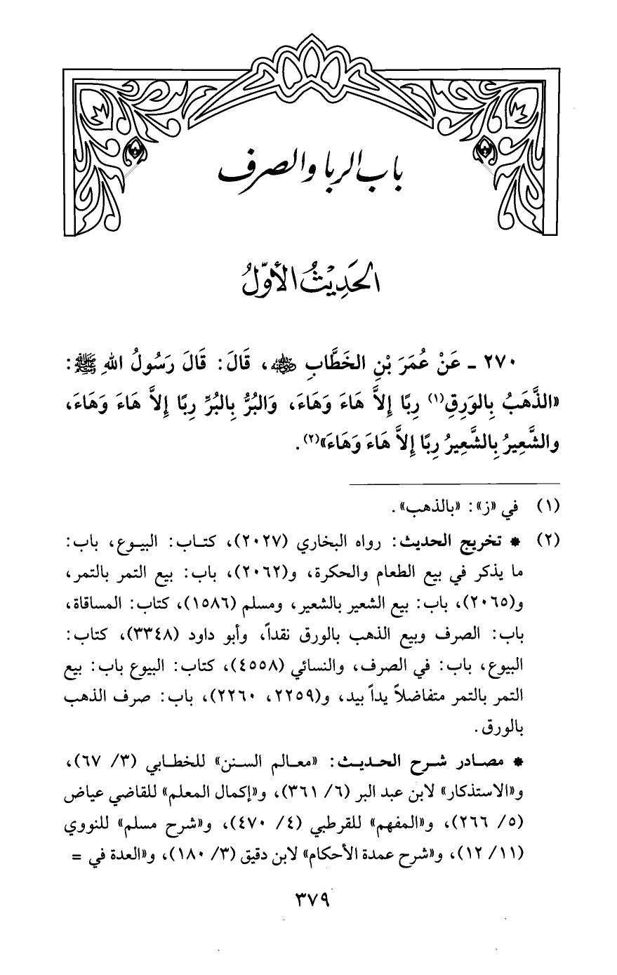 270 - عَنْ عُمَرَ بْنِ الخَطَّابِ -رضي اللَّه عنه-، قَالَ: قَالَ رَسُولُ اللَّهِ -صلى اللَّه عليه وسلم-: "الذَّهَبُ بِالوَرِقِ (¬1) رِبًا إِلَّا هَاءَ وَهَاءَ، وَالبُرُّ بِالبُرِّ رِبًا إِلَّا هَاءَ وَهَاءَ، والشَّعِيرُ بِالشَّعِيرُ رِبًا إِلَّا هَاءَ وَهَاءَ" (¬2).