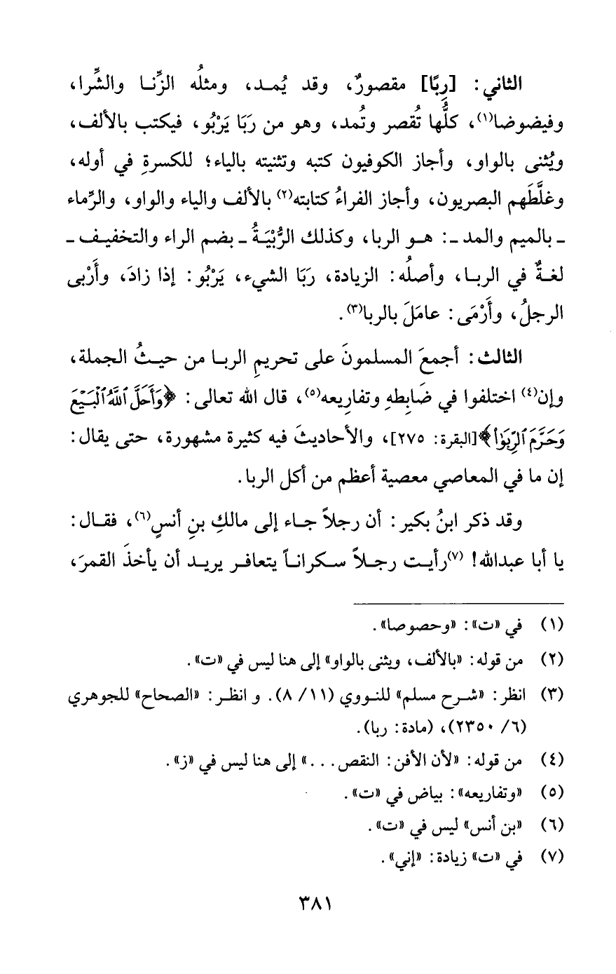 الثاني: [رِبًا] مقصورٌ، وقد يُمد، ومثلُه الزِّنا والشِّرا، وفيضوضا (¬1)، كلُّها تُقصر وتُمد، وهو من رَبَا يَرْبُو، فيكتب بالألف، ويثنى بالواو، وأجاز الكوفيون كتبه وتثنيته بالياء؛ للكسرةِ في أوله، وغلَّطَهم البصريون، وأجاز الفراءُ كتابته (¬2) بالألف والياء والواو، والرِّماء -بالميم والمد-: هو الربا، وكذلك الرُّبْيَةُ -بضم الراء والتخفيف- لغةٌ في الربا، وأصلُه: الزيادة، رَبَا الشيء، يَرْبُو: إذا زادَ، وأَرْبى الرجلُ، وأَرْمَى: عامَلَ بالربا (¬3).