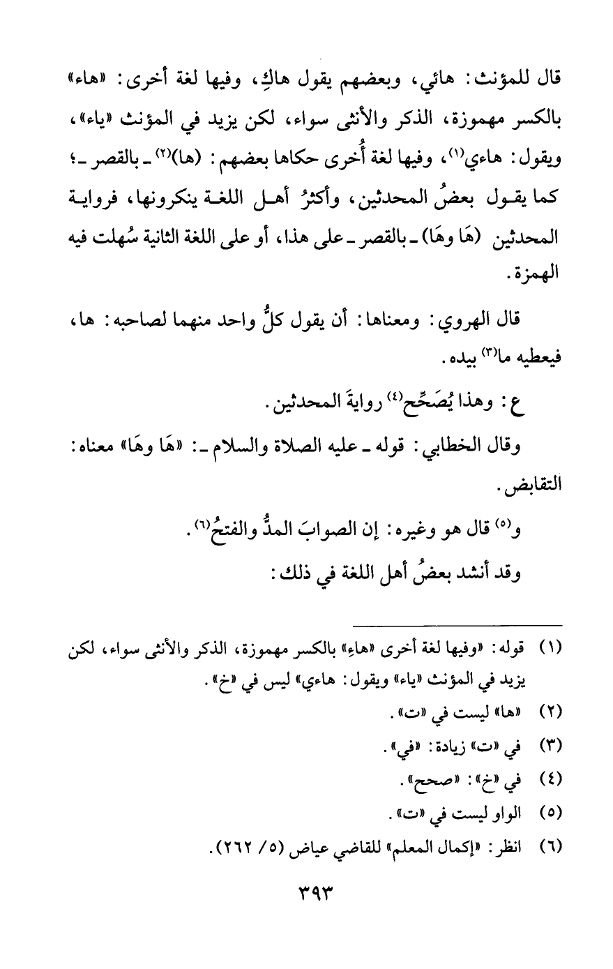 قال للمؤنث: هائي، وبعضهم يقول هاكِ، وفيها لغة أخرى: "هاء" بالكسر مهموزة، الذكر والأنثى سواء، لكن يزيد في المؤنث "ياء"، ويقول: هاءي (¬1)، وفيها لغة أُخرى حكاها بعضهم: (ها) (¬2) -بالقصر-؛ كما يقول بعضُ المحدثين، وأكثرُ أهل اللغة ينكرونها، فرواية المحدثين (هَا وهَا) -بالقصر- على هذا، أو على اللغة الثانية سُهلت فيه الهمزة.