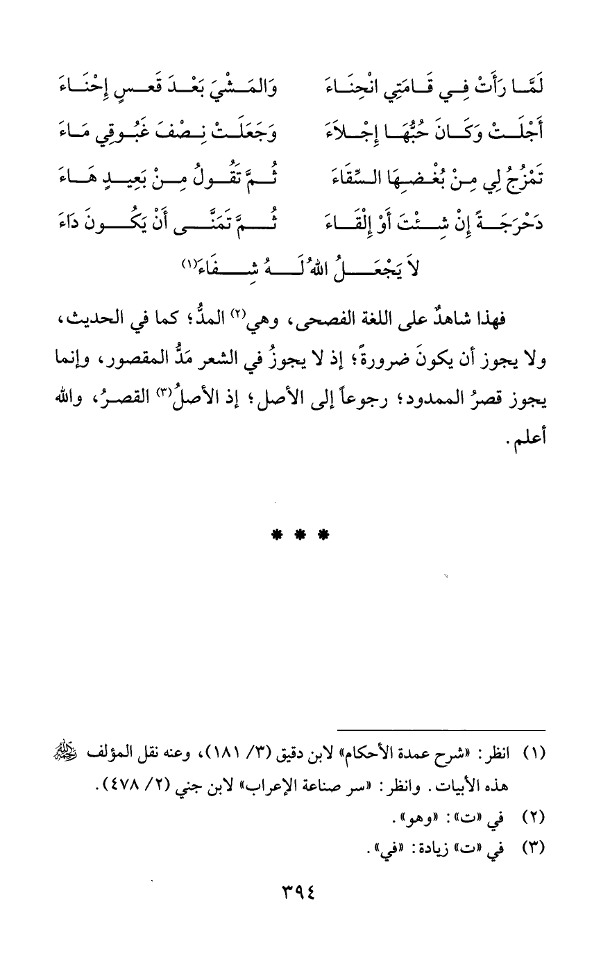 (¬1) انظر: "شرح عمدة الأحكام" لابن دقيق (3/ 181)، وعنه نقل المؤلف رحمه اللَّه هذه الأبيات. وانظر: "سر صناعة الإعراب" لابن جني (2/ 478).