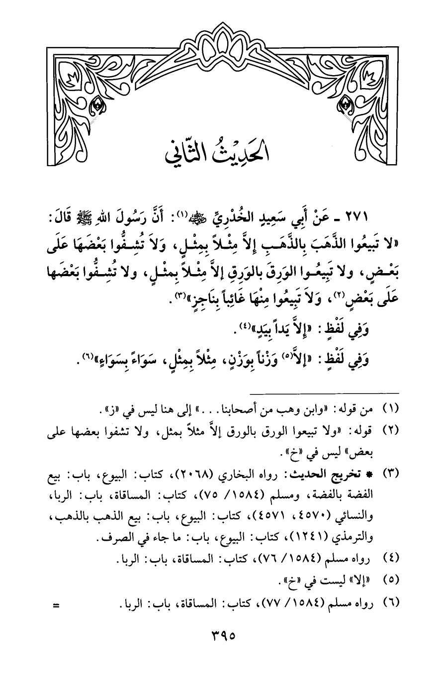 271 - عَنْ أبَي سَعِيدٍ الخُدْرِيِّ -رضي اللَّه عنه- (¬1): أَنَّ رَسُولَ اللَّهِ -صلى اللَّه عليه وسلم- قَالَ: "لا تَبيعُوا الذَّهَبَ بِالذَّهَبِ إِلَّا مِثْلًا بِمِثْلٍ، وَلَا تُشِفُّوا بَعْضَهَا عَلَى بَعْضٍ، ولا تَبِيعُوا الوَرِقَ بالوَرِقِ إلَّا مِثْلًا بِمثْلٍ، ولا تُشِفُّوا بَعْضَها عَلَى بَعْضٍ (¬2)، وَلَا تَبِيعُوا مِنْهَا غَائِبًا بِنَاجِزٍ" (¬3).