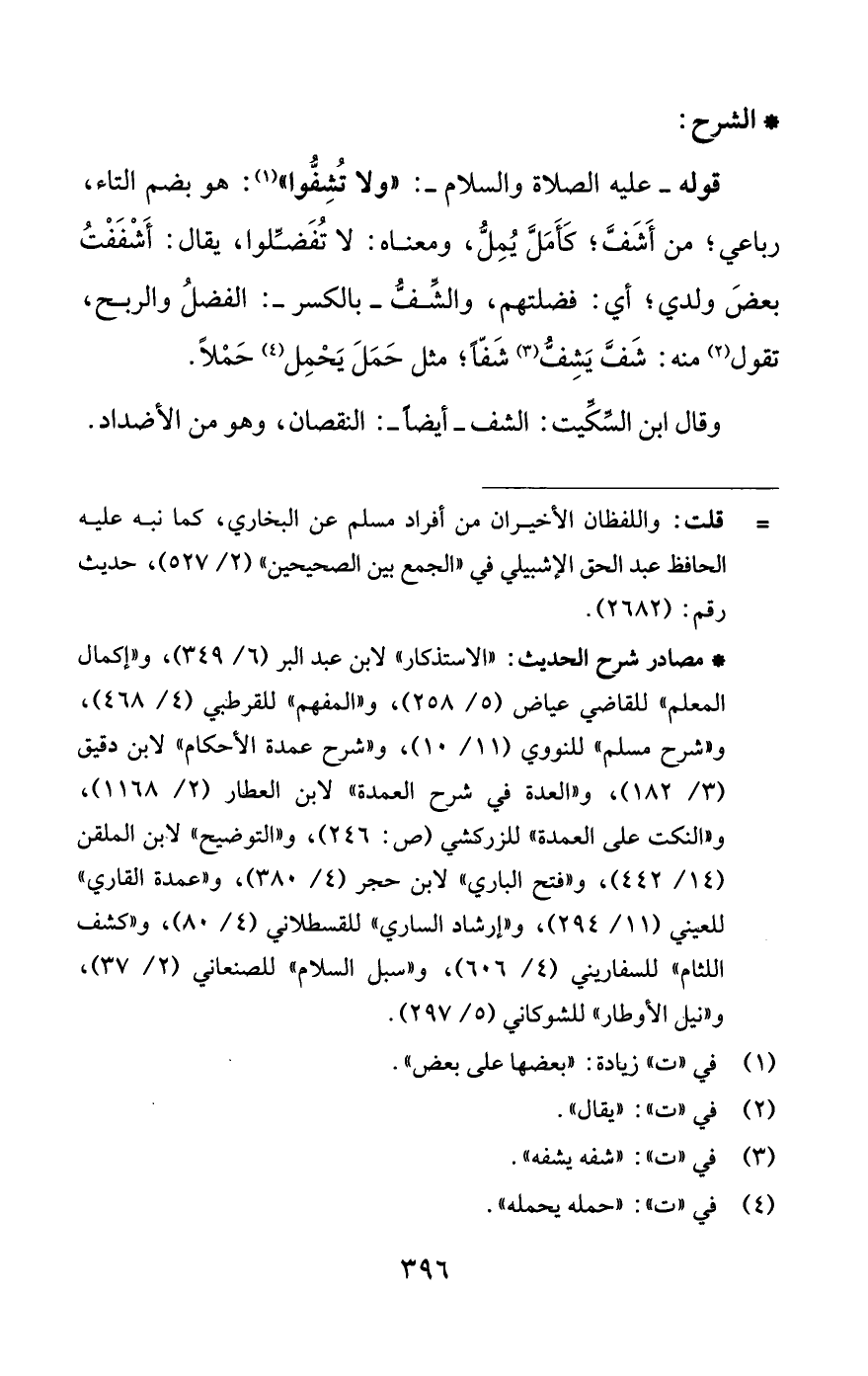 قوله -عليه الصلاة والسلام-: "ولا تُشِفُّوا" (¬1): هو بضم التاء، رباعي؛ من أَشَفَّ؛ كَأَمَلَّ يُمِلُّ، ومعناه: لا تُفَضِّلوا، يقال: أَشْفَفْتُ بعضَ ولدي؛ أي: فضلتهم، والشِّفُّ -بالكسر-: الفضلُ والربح، تقول (¬2) منه: شَفَّ يَشِف (¬3) شَفًّا؛ مثل حَمَلَ يَحْمِل (¬4) حَمْلًا.