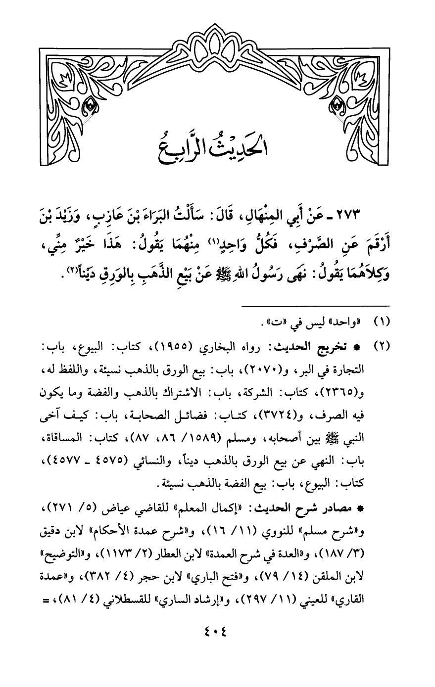 273 - عَنْ أَبي المِنْهَالِ، قَالَ: سَأَلْتُ البَرَاءَ بْنَ عَازِبٍ، وَزَيْدَ بْنَ أَرْقَمَ عَنِ الصَّرْفِ، فَكُلُّ وَاحِدٍ (¬1) مِنْهُمَا يَقُولُ: هَذَا خَيْر مِنِّي، وَكِلَاهُمَا يَقُولُ: نَهَى رَسُولُ اللَّهِ -صلى اللَّه عليه وسلم- عَنْ بَيْعِ الذَّهَبِ بِالوَرِقِ دَيْنًا (¬2).