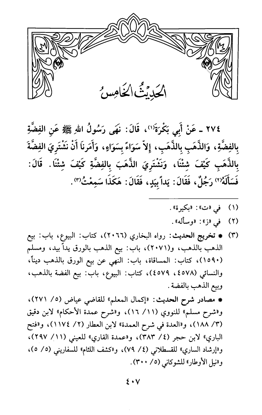 274 - عَنْ أَبِي بَكْرَةَ (¬1)، قَالَ: نهَى رَسُولُ اللَّهِ -صلى اللَّه عليه وسلم- عَنِ الفِضَّةِ بِالفِضَّةِ، وَالذَّهَبِ بِالذَّهَبِ، إِلّا سَوَاءٍ بِسَوَاءٍ، وَأَمَرنَا أَنْ نشتَرِيَ الفِضَّةَ بِالذَّهَبِ كيْفَ شِئْنَا، وَنشتَرِيَ الذَّهَبَ بِالفِضَّةِ كيْفَ شِئْنَا. قَالَ: فَسَألَهُ (¬2) رَجُلٌ، فَقَالَ: يَدًا بِيَدٍ، فَقَالَ: هَكَذَا سَمِعْتُ (¬3).