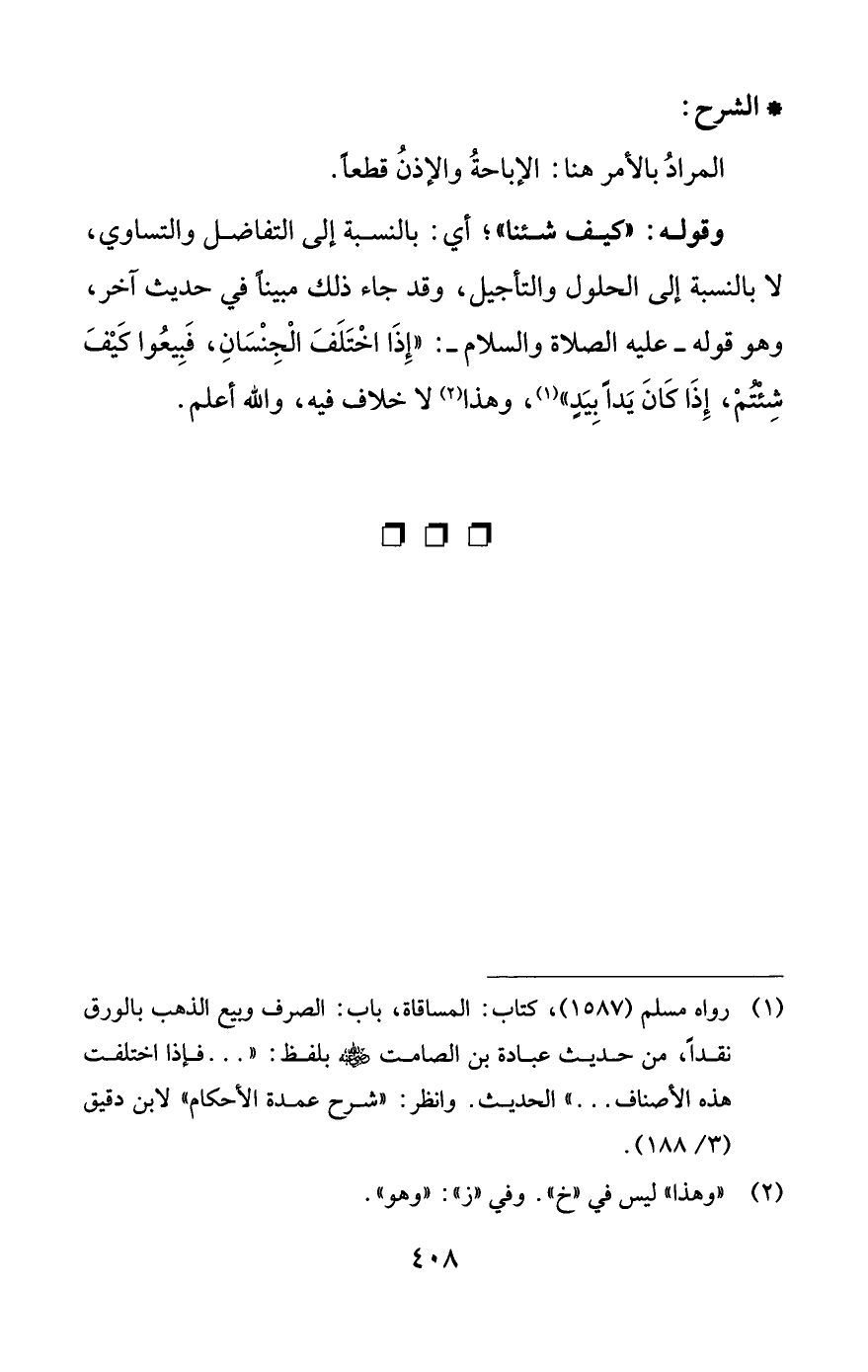 (¬1) رواه مسلم (1587)، كتاب: المساقاة، باب: الصرف وييع الذهب بالورق نقدًا، من حديث عبادة بن الصامت -رضي اللَّه عنه- بلفظ: ". . . فإذا اختلفت هذه الأصناف. . . " الحديث. وانظر: "شرح عمدة الأحكام" لابن دقيق (3/ 188).