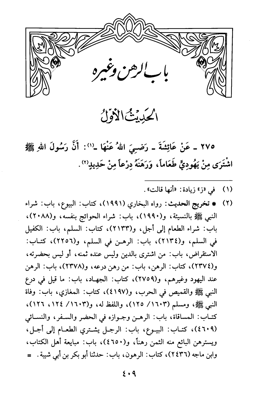275 - عَنْ عَائِشَةَ -رَضِيَ اللَّهُ عَنْهَا- (¬1): أَنَّ رَسُولَ اللَّهِ -صلى اللَّه عليه وسلم- اشترى مِنْ يَهُودِيٍّ طَعَامًا، وَرَهَنَهُ دِرْعًا مِنْ حَدِيدٍ (¬2).