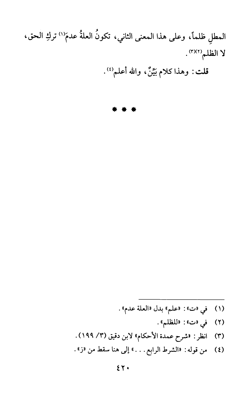 المطلِ ظلمًا، وعلى هذا المعنى الثاني، تكونُ العلةُ عدمَ (¬1) تركِ الحق، لا الظلم (¬2) (¬3).