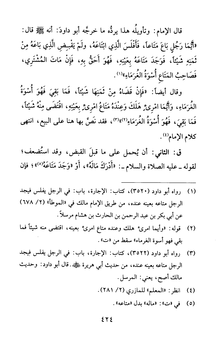 (¬3) رواه أبو داود (3522)، كتاب: الإجارة، باب: في الرجل يفلس فيجد الرجل متاعه بعينه عنده، من حديث أبي هريرة -رضي اللَّه عنه-. قال أبو داود: وحديث مالك أصح، يعني: المرسل.