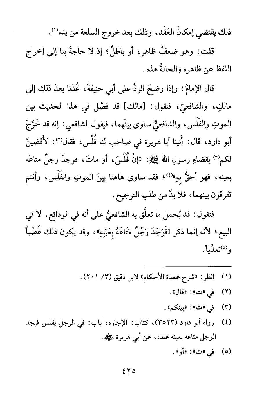 قال الإمامُ: وإذا وضحَ الردُّ على أبي حنيفةَ، عُدْنا بعدَ ذلك إلى مالكٍ، والشافعيِّ، فنقول: [مالك] قد فصَّل في هذا الحديث بين الموتِ والفَلَس، والشافعيُّ ساوى بينَهما، فيقول الشافعي: إنه قد خَرَّجَ أبو داود، قال: أَتينا أبا هريرة في صاحب لنا فُلِّس، فقال (¬2): لأَقضينَّ لكم (¬3) بقضاءِ رسولِ اللَّه -صلى اللَّه عليه وسلم-: "إنْ فُلِّسَ، أو ماتَ، فوجدَ رجل متاعَه بعينه، فهو أحقُّ بِهِ" (¬4)، فقد ساوى ها هنا بينَ الموتِ والفَلَس، وأنتم تفرقون بينهما، فلا بدَّ من طلب الترجيح.