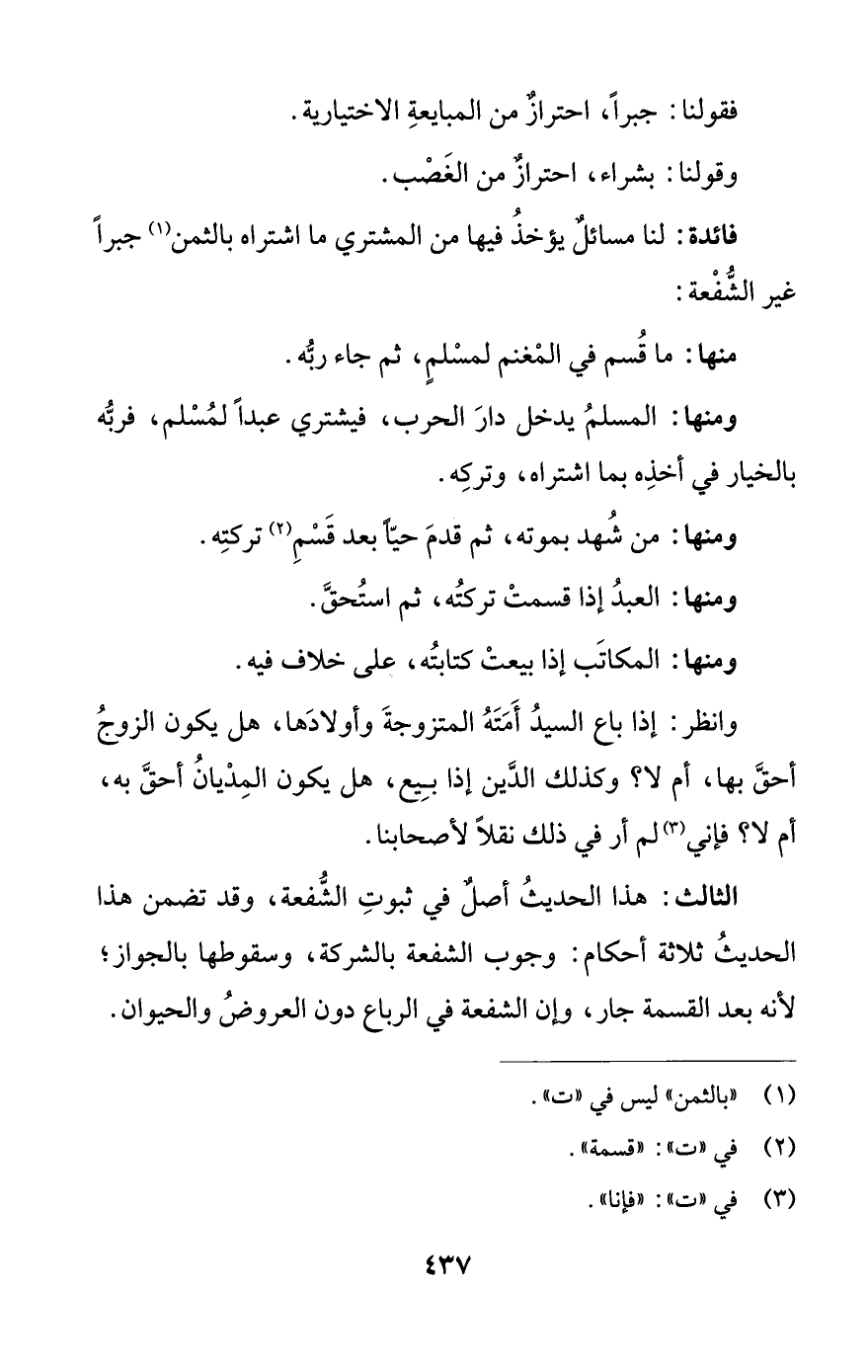 الثالث: هذا الحديثُ أصلٌ في ثبوتِ الشُّفعة، وقد تضمن هذا الحديثُ ثلاثة أحكام: وجوب الشفعة بالشركة، وسقوطها بالجواز؛ لأنه بعد القسمة جار، وإن الشفعة في الرباع دون العروضُ والحيوان.