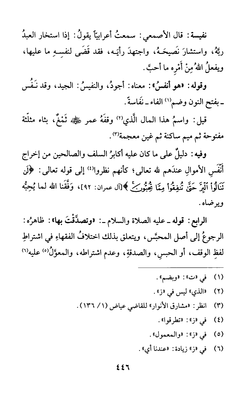 الرابع: قوله -عليه الصلاة والسلام-: "وتصدَّقْتَ بها": ظاهرُه: الرجوعُ إلى أصل المحبَّس، ويتعلق بذلك اختلافُ الفقهاءِ في اشتراطِ لفظِ الوقف، أو الحبسِ، والصدقةِ، وعدم اشتراطه، والمعوَّلُ (¬5) عليه (¬6)