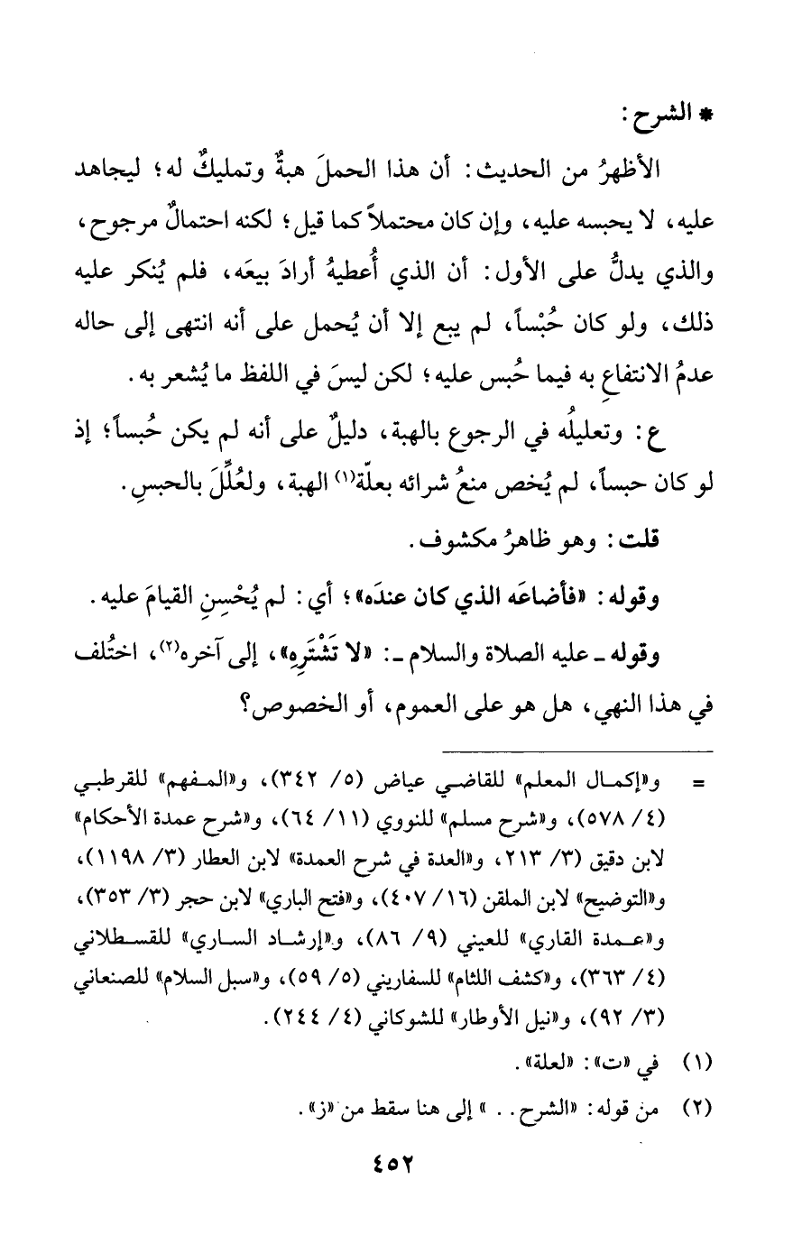 ع: وتعليلُه في الرجوع بالهبة، دليلٌ على أنه لم يكن حُبسًا؛ إذ لو كان حبسًا، لم يُخص منعُ شرائه بعلّة (¬1) الهبة، ولعُلِّلَ بالحبسِ.
