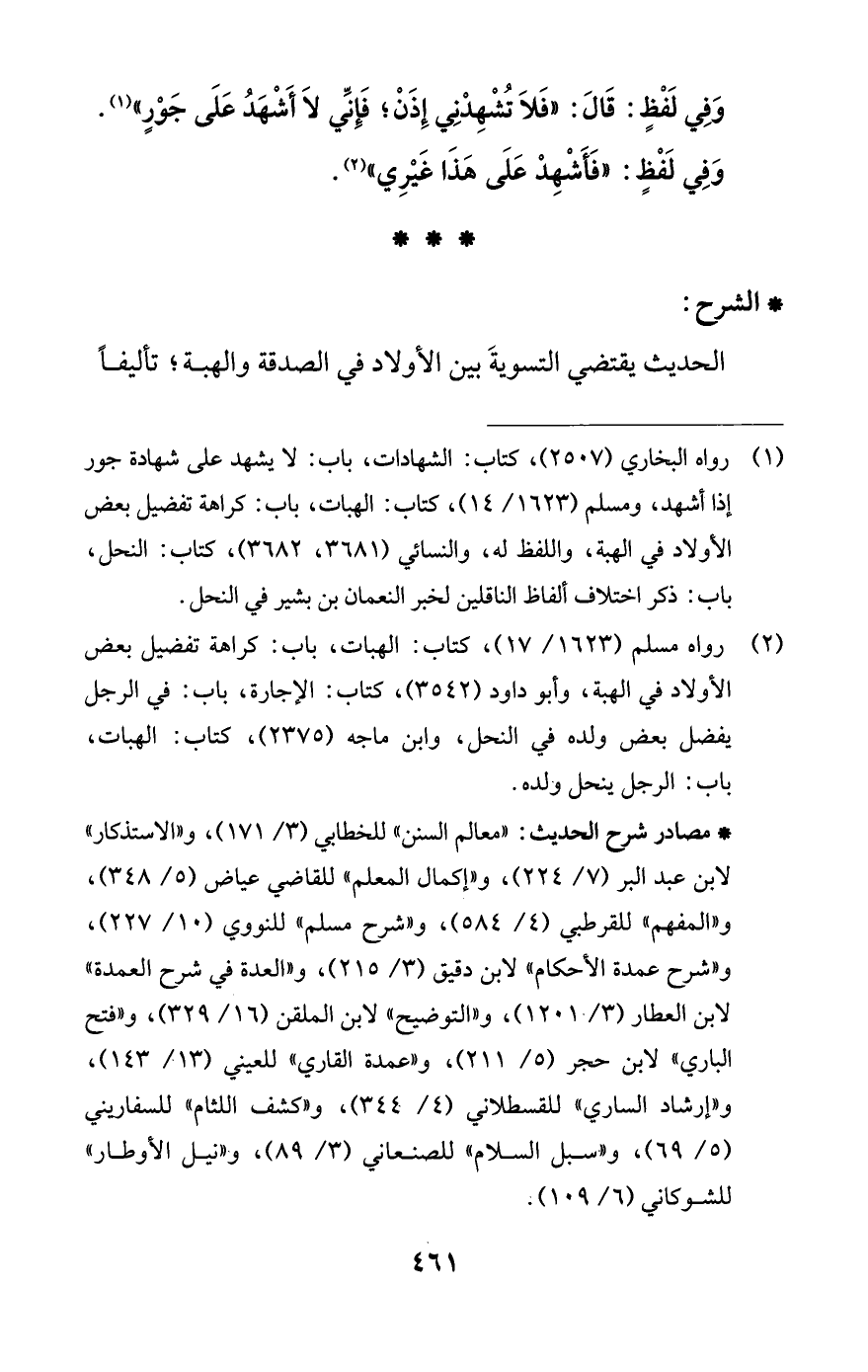 (¬1) رواه البخاري (2507)، كتاب: الشهادات، باب: لا يشهد على شهادة جور إذا أشهد، ومسلم (1623/ 14)، كتاب: الهبات، باب: كراهة تفضيل بعض الأولاد في الهبة، واللفظ له، والنسائي (3681، 3682)، كتاب: النحل، باب: ذكر اختلاف ألفاظ الناقلين لخبر النعمان بن بشير في النحل.