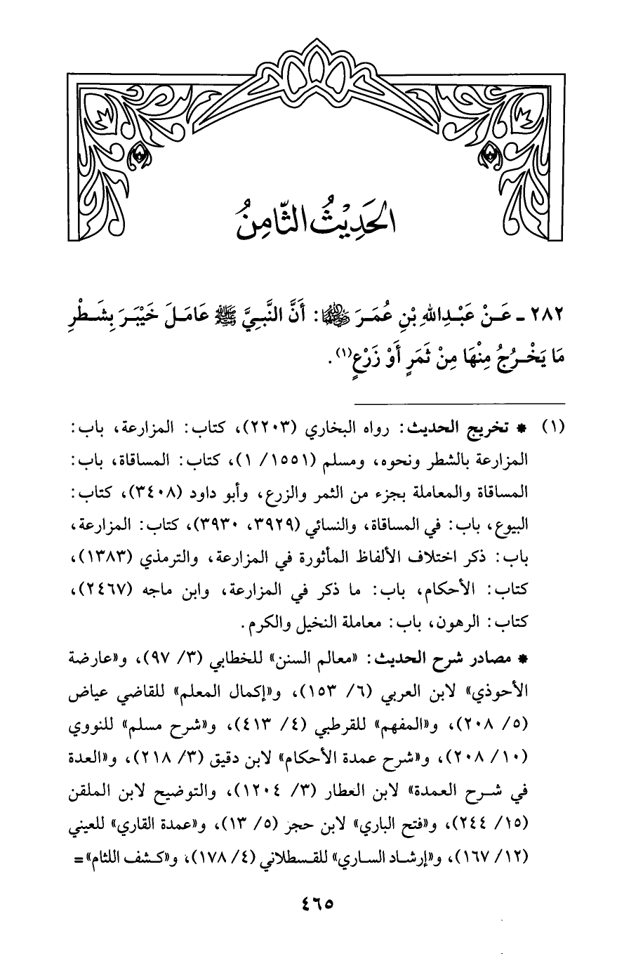 282 - عَنْ عَبْدِ اللَّهِ بْنِ عُمَرَ -رضي اللَّه عنهما-: أَنَّ النَّبِيَّ -صلى اللَّه عليه وسلم- عَامَلَ خَيْبَرَ بِشَطْرِ مَا يَخْرُجُ مِنْهَا مِنْ ثَمَرٍ أَوْ زَرْعٍ (¬1).