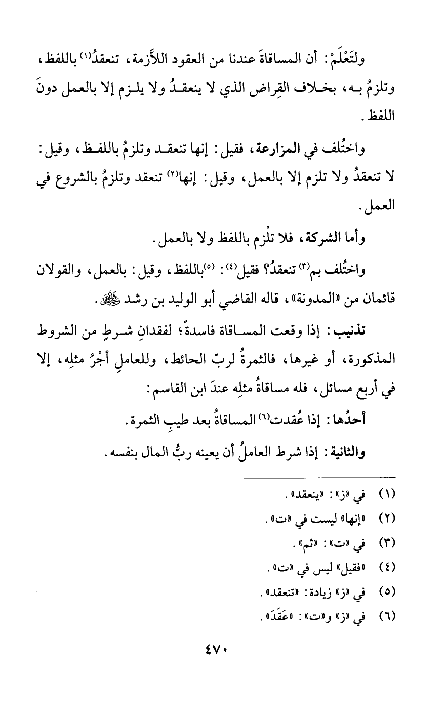ولتَعْلَمْ: أن المساقاةَ عندنا من العقود اللَّازمة، تنعقدُ (¬1) باللفظ، وتلزمُ به، بخلاف القِراض الذي لا ينعقدُ ولا يلزم إلا بالعمل دونَ اللفظ.