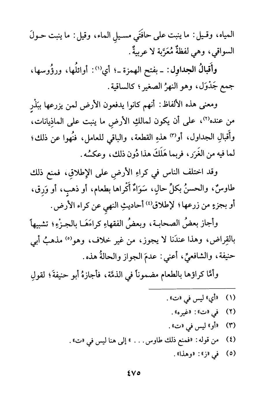 ومعنى هذه الألفاظ: أنهم كانوا يدفعون الأرض لمن يزرعها ببَذْرٍ من عنده (¬2)، على أن يكون لمالكِ الأرضِ ما ينبت على الماذِيانات، وأَقبالِ الجداول، أو (¬3) هذهِ القطعة، والباقي للعامل، فنُهوا عن ذلك؛ لما فيه من الغَرَر، فربما هَلَكَ هذا دُون ذلك، وعكسُه.