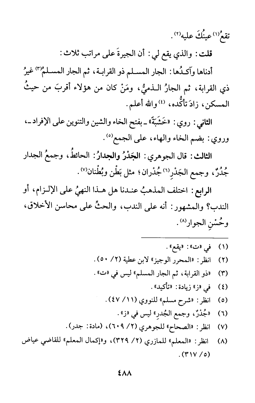 قلت: والذي يقع لي: أن الجيرةَ على مراتب ثلاث:
