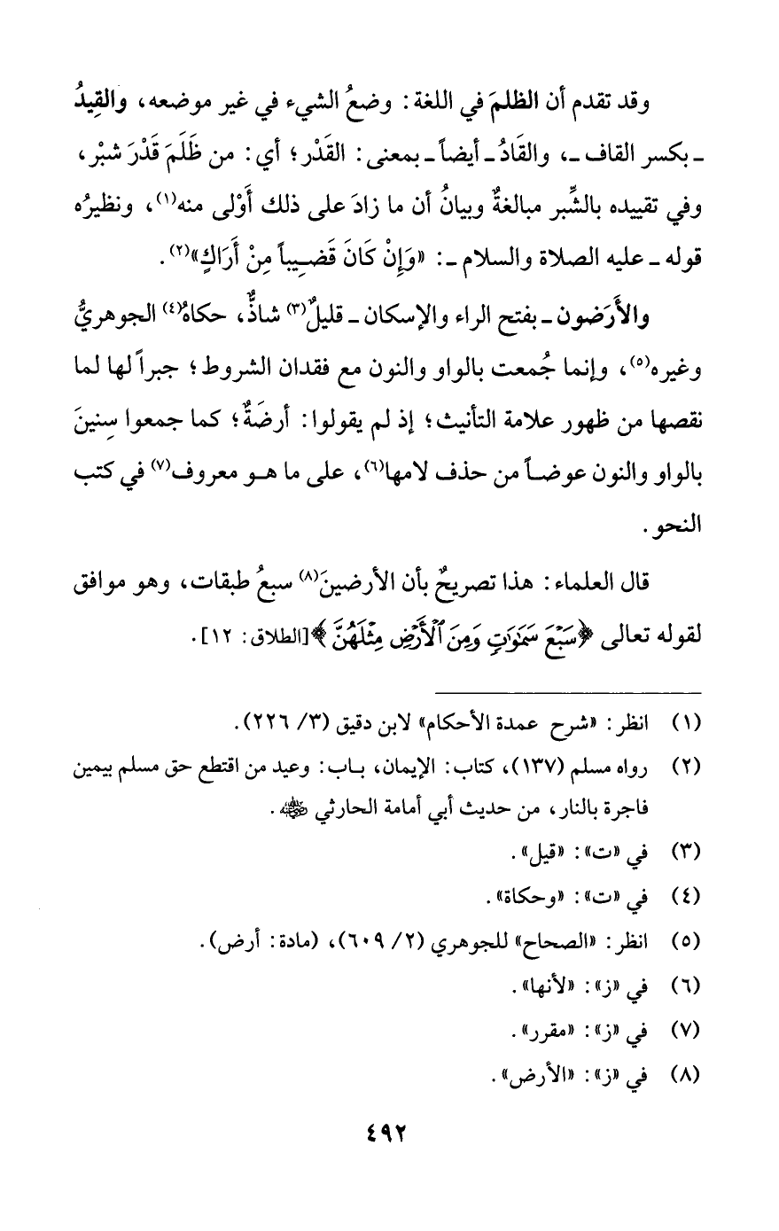 والأَرَضون -بفتح الراء والإسكان- قليلٌ (¬3) شاذٌّ، حكاهُ (¬4) الجوهريُّ وغيره (¬5)، وإنما جُمعت بالواو والنون مع فقدان الشروط؛ جبرًا لها لما نقصها من ظهور علامة التأنيث؛ إذ لم يقولوا: أرضَةٌ؛ كما جمعوا سِنينَ بالواو والنون عوضًا من حذف لامها (¬6)، على ما هو معروف (¬7) في كتب النحو.