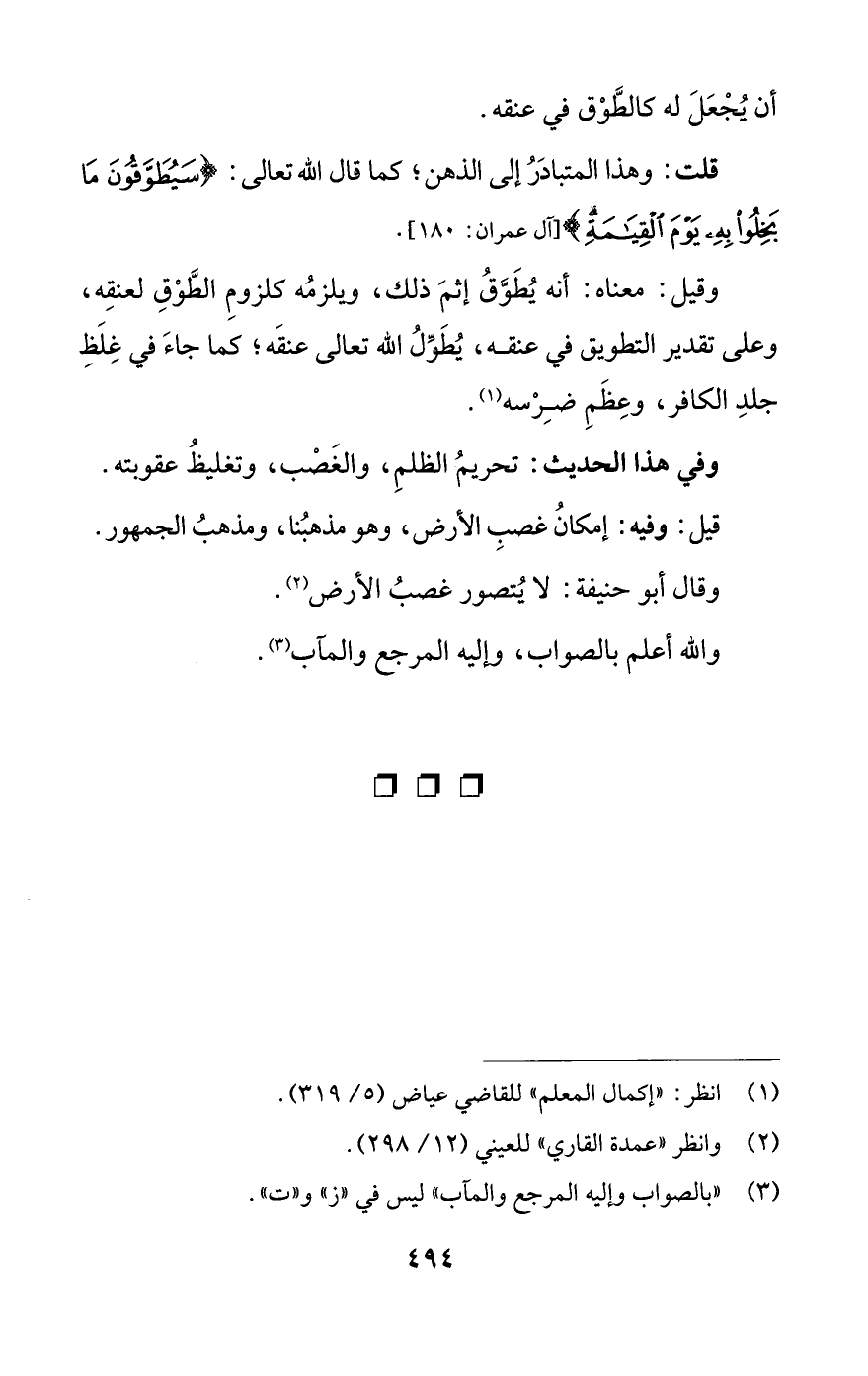 وقيل: معناه: أنه يُطَوَّقُ إثمَ ذلك، ويلزمُه كلزومِ الطَّوْقِ لعنقِه، وعلى تقدير التطويق في عنقه، يُطَوِّلُ اللَّه تعالى عنقَه؛ كما جاءَ في غِلَظِ جلدِ الكافر، وعِظَمِ ضِرْسه (¬1).