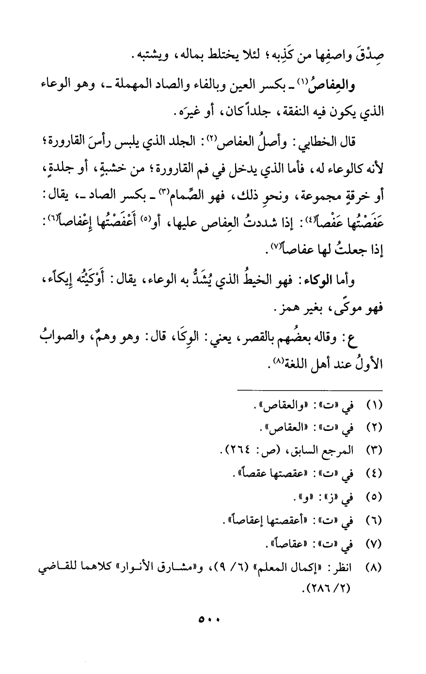 قال الخطابي: وأصلُ العفاص (¬2): الجلد الذي يلبس رأسَ القارورة؛ لأنه كالوعاء له، فأما الذي يدخل في فم القارورة؛ من خشبةٍ، أو جلدةٍ، أو خرقةٍ مجموعة، ونحوِ ذلك، فهو الصِّمام (¬3) -بكسر الصاد-، يقال: عَفَصْتُها عَفْصًا (¬4): إذا شددتُ العِفاص عليها، أو (¬5) أَعْفَصْتُها إِعْفاصًا (¬6): إذا جعلتُ لها عفاصًا (¬7).