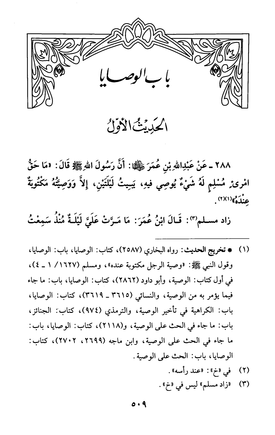 288 - عَنْ عَبْدِ اللَّهِ بْنِ عُمَرَ -رضي اللَّه عنهما-: أَنَّ رَسُولَ اللَّهِ -صلى اللَّه عليه وسلم- قَالَ: "مَا حَقُّ امْرىءٍ مُسْلِمٍ لَهُ شَيْءٌ يُوصِي فيهِ، يَبيِتُ لَيْلَتَيْنِ، إِلَّا وَوَصِيَّتُهُ مَكْتُوبَةٌ عِنْدَهُ" (¬1) (¬2).