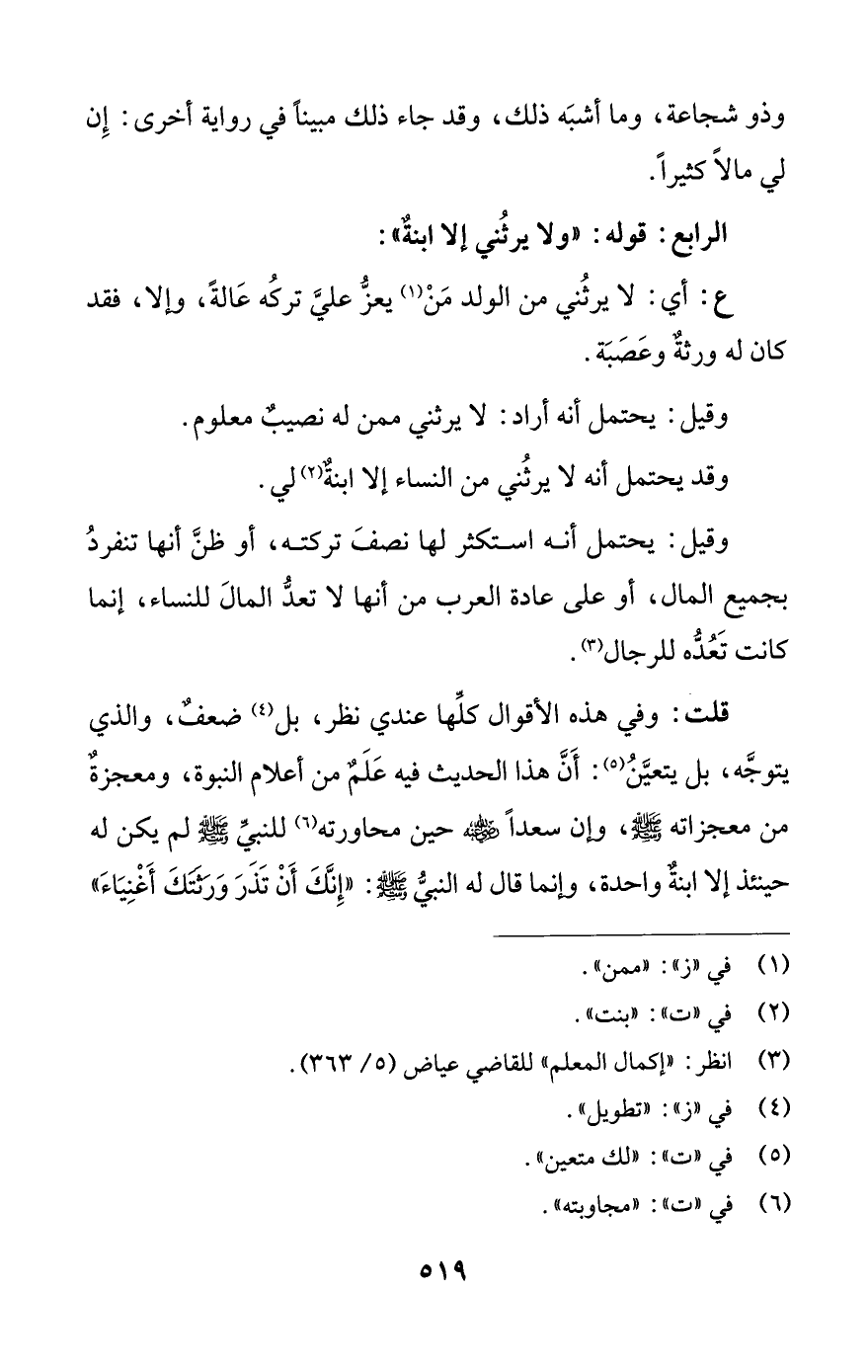قلت: وفي هذه الأقوال كلِّها عندي نظر، بل (¬4) ضعفٌ، والذي يتوجَّه، بل يتعيَّنُ (¬5): أَنَّ هذا الحديث فيه عَلَمٌ من أعلام النبوة، ومعجزةٌ من معجزاته -صلى اللَّه عليه وسلم-، كان سعدًا -رضي اللَّه عنه- حين محاورته (¬6) للنبيِّ -صلى اللَّه عليه وسلم- لم يكن له حينئذ إلا ابنةٌ واحدة، وإنما قال له النبيُّ -صلى اللَّه عليه وسلم-: "إِنَّكَ أَنْ تَذَرَ وَرثَتَكَ أَغْنِيَاءَ"