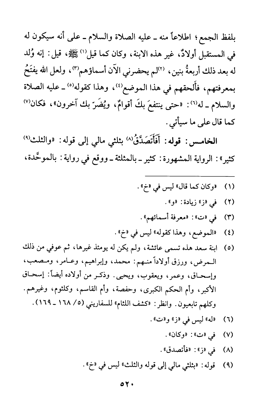 (¬5) ابنة سعد هذه تسمى عائشة، ولم يكن له يومئذ غيرها، ثم عوفي من ذلك المرض، ورزق أولادًا منهم: محمد، وإبراهيم، وعامر، ومصعب، وإسحاق، وعمر، ويعقوب، ويحيى. وذكر من أولاده أيضًا: إسحاق الاكبر، وأم الحكم الكبرى، وحفصة، وأم القاسم، وكلثوم، وغيرهم. وكلهم تابعيون. وانظر: "كشف اللثام" للسفاريني (5/ 168 - 169).