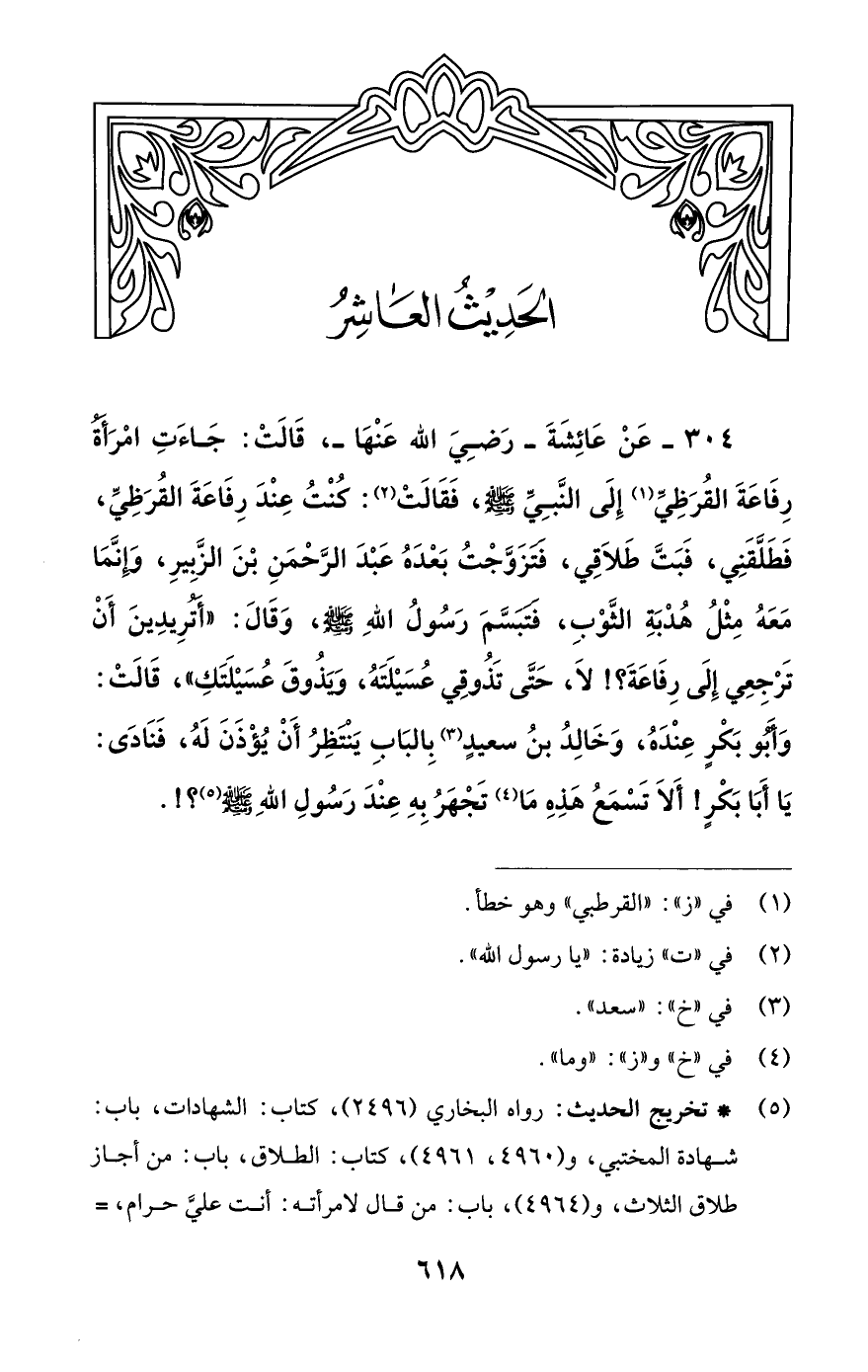 304 - عَنْ عَائِشَةَ -رَضِيَ اللَّه عَنْهَا-، قَالَتْ: جَاءَتِ امْرَأةُ رِفَاعَةَ القُرَظِيِّ (¬1) إِلَى النَّبِيِّ -صلى اللَّه عليه وسلم-، فَقَالَتْ (¬2): كُنْتُ عِنْدَ رِفَاعَةَ القُرَظِيِّ، فَطَلَّقَنِي، فَبَتَّ طَلَاقِي، فتَزَوَّجْتُ بَعْدَهُ عَبْدَ الرَّحْمَنِ بْنَ الزَّبِيرِ، وَإِنَّمَا مَعَهُ مِثْلُ هُدْبَةِ الثَّوبِ، فتَبَسَّمَ رَسُولُ اللَّه -صلى اللَّه عليه وسلم-، وَقَالَ: "أترِيدِينَ أَنْ تَرْجِعِي إِلَى رِفَاعَةَ؟! لَا، حَتَّى تَذُوقِي عُسَيْلَتَهُ، وَيَذُوقَ عُسَيْلَتَكِ"، قَالَتْ: وَأَبُو بَكْرٍ عِنْدَهُ، وَخَالِدُ بنُ سعيدٍ (¬3) بِالبَابِ يَنتظِرُ أَنْ يُؤْذَنَ لَهُ، فَنَادَى: يَا أَبَا بَكْرٍ! أَلَا تَسْمَعُ هَذِهِ مَا (¬4) تَجْهَرُ بِهِ عِنْدَ رَسُولِ اللَّه -صلى اللَّه عليه وسلم- (¬5)؟!.