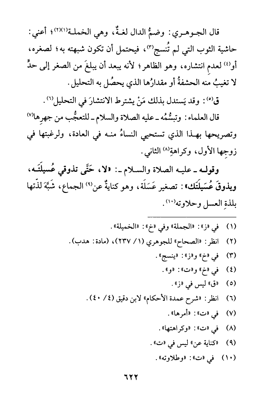 قال الجوهري: وضمُّ الدال لغةٌ، وهي الخملة (¬1) (¬2)؛ أعني: حاشية الثوب التي لم تُنسج (¬3)، فيحتمل أن تكون شبهته به؛ لصغره، أو (¬4) لعدمِ انتشاره، وهو الظاهر؛ لأنه يبعد أن يبلغَ من الصغر إلى حدٍّ لا تغيبُ منه الحشفةُ أو مقدارُها الذي يحصُل به التحليل.
