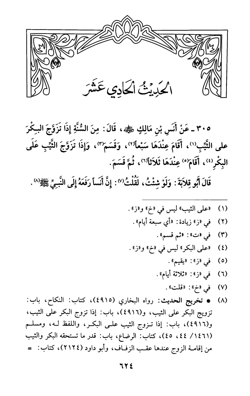 305 - عَنْ أَنسَ بْنِ مَالِكٍ -رضي اللَّه عنه-، قَالَ: مِنَ السُّنَّةِ إِذَا تَزَوَّجَ البِكْرَ على الثَّيِّبِ (¬1)، أَقَامَ عِنْدَهَا سَبْعًا (¬2)، وَقَسَمَ (¬3)، وَإِذَا تَزَوَّجَ الثَّيِّبِ عَلَى البِكْرِ (¬4)، أَقَامَ (¬5) عِنْدَهَا ثَلَاثًا (¬6)، ثُمَّ قَسَمَ.