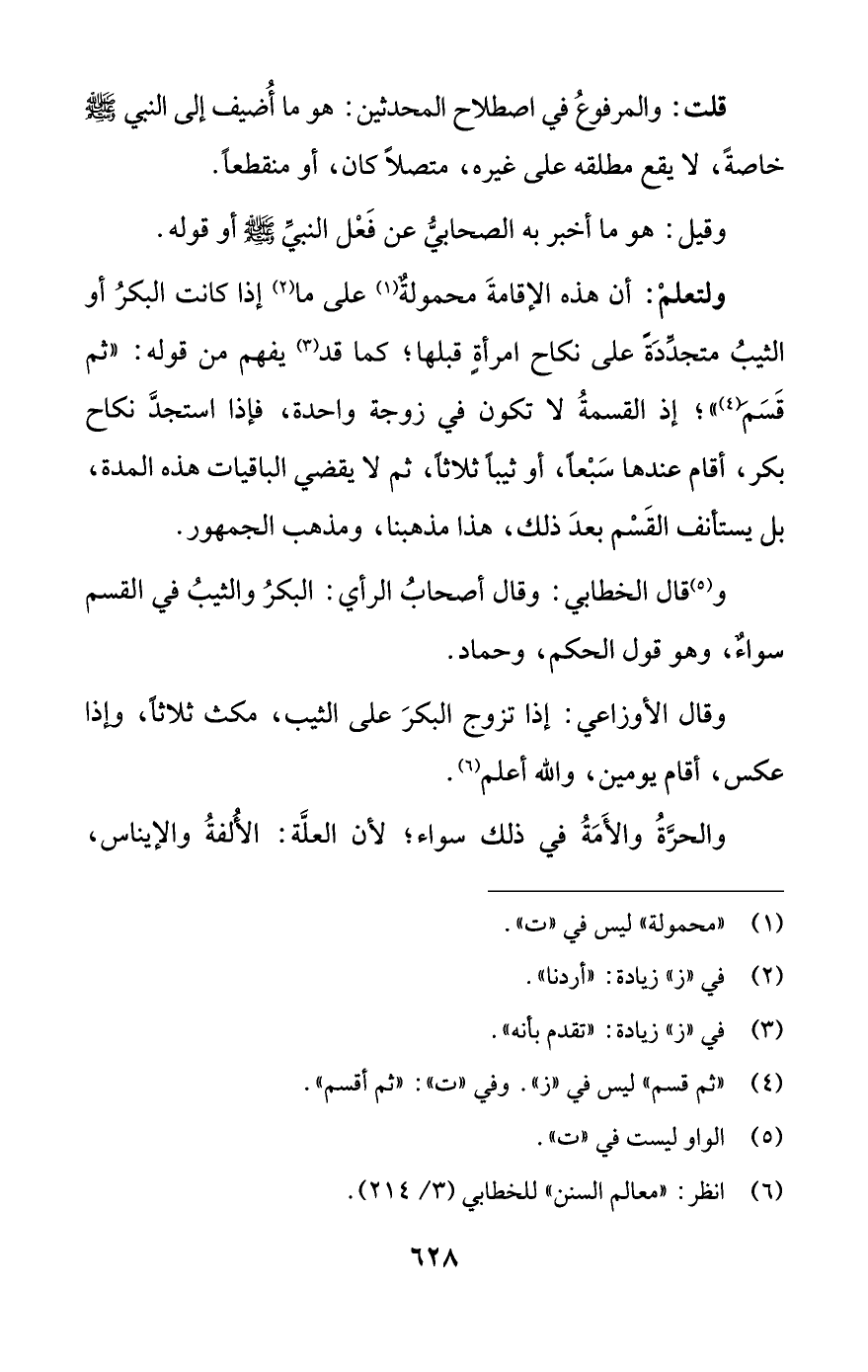 و (¬5) قال الخطابي: وقال أصحابُ الرأي: البكرُ والثيبُ في القسم سواءٌ، وهو قول الحكم، وحماد.