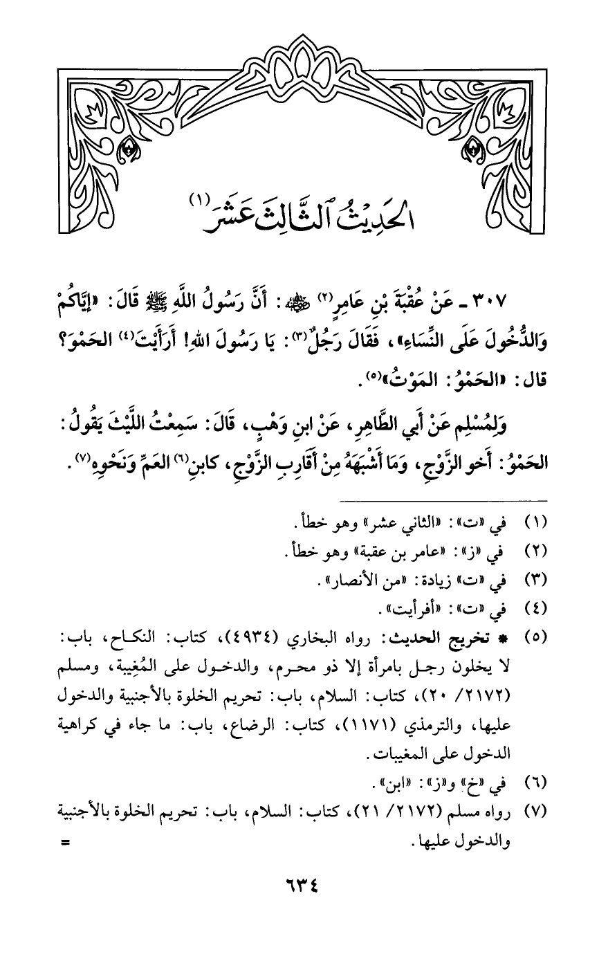 307 - عَنْ عُقْبةَ بنِ عَامِرٍ (¬2) -رضي اللَّه عنه-: أَنَّ رَسُولُ اللَّهِ -صلى اللَّه عليه وسلم- قَالَ: "إيَّاكُمْ وَالدُّخُولَ عَلَى النِّسَاء"، فَقَالَ رَجُلٌ (¬3): يَا رَسولَ اللَّه! أَرَأَيْتَ (¬4) الحَمْوَ؟ قال: "الحَمْوُ: المَوْتُ" (¬5).