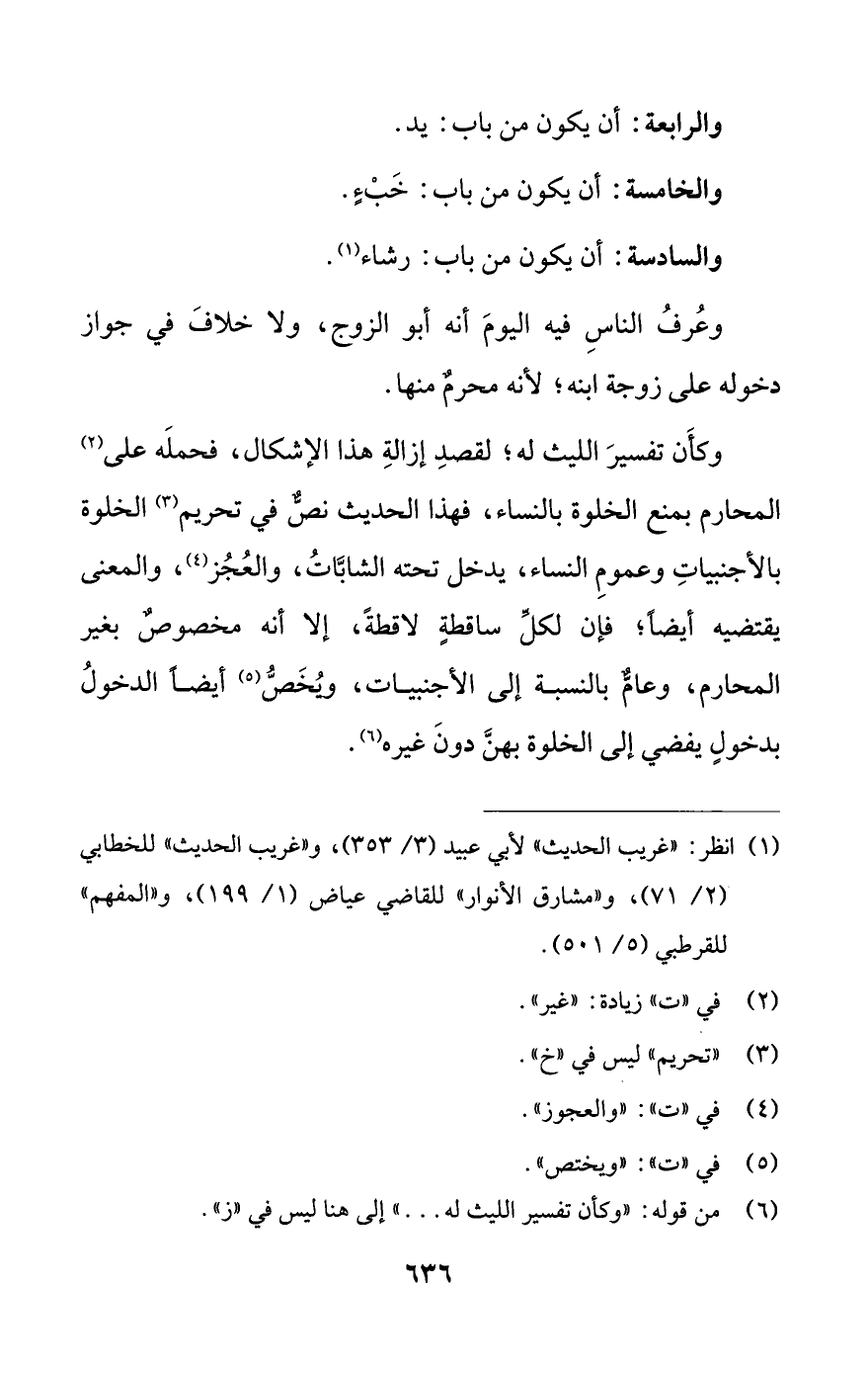 وكأن تفسيرَ الليث له؛ لقصدِ إزالةِ هذا الإشكال، فحملَه على (¬2) المحارم بمنع الخلوة بالنساء، فهذا الحديث نصٌّ في تحريم (¬3) الخلوة بالأجنبياتِ وعمومِ النساء، يدخل تحته الشابَّاتُ، والعُجُز (¬4)، والمعنى يقتضيه أيضًا؛ فإن لكلّ ساقطةٍ لاقطةً، إلا أنه مخصوصٌ بغير المحارم، وعامٌّ بالنسبة إلى الأجنبيات، ويُخَصُّ (¬5) أيضًا الدخولُ بدخولٍ يفضي إلى الخلوة بهنَّ دونَ غيره (¬6).
