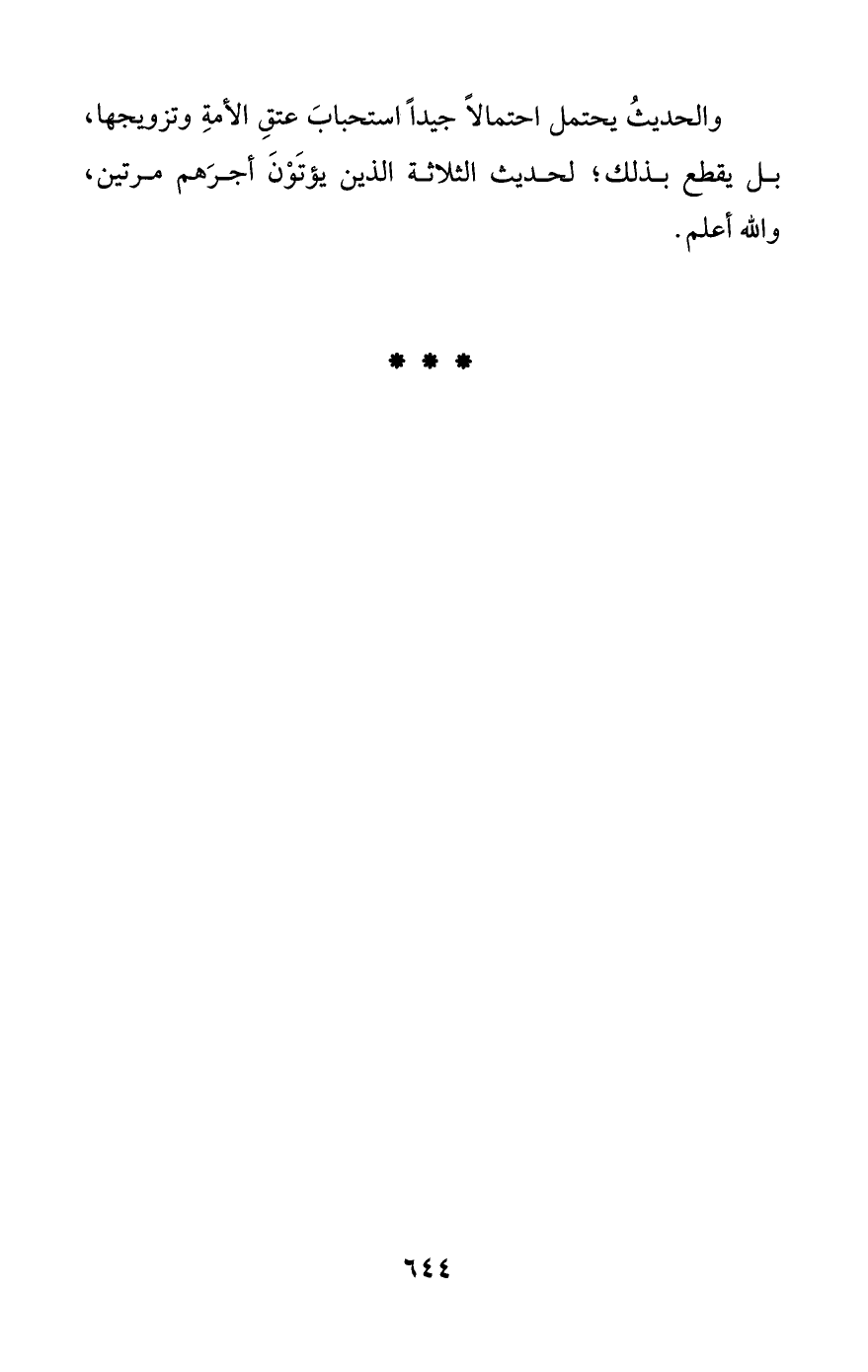 والحديثُ يحتمل احتمالًا جيدًا استحبابَ عتقِ الأمةِ وتزويجها، بل يقطع بذلك؛ لحديث الثلاثة الذين يؤتَوْنَ أجرَهم مرتين، واللَّه أعلم.