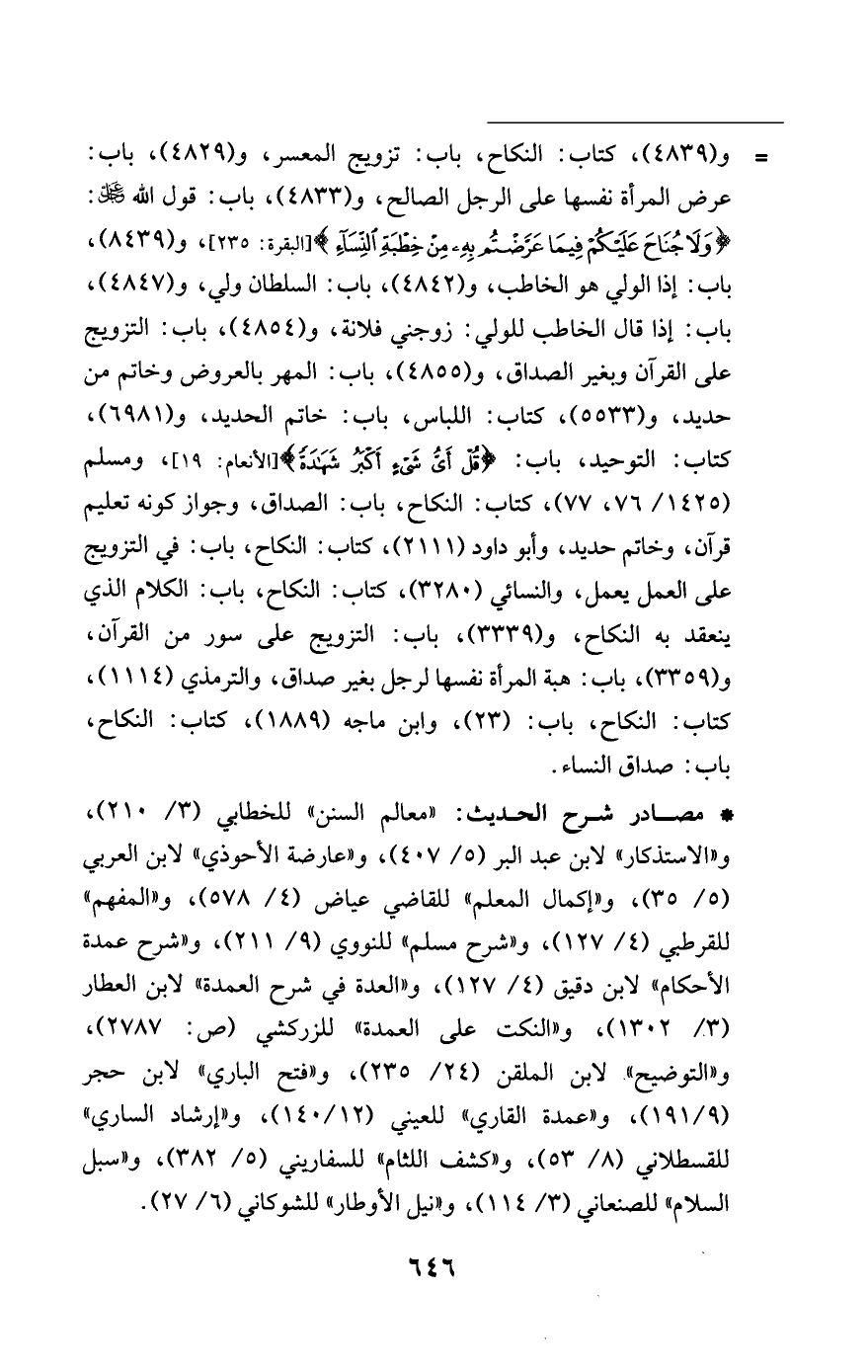 = و (4839)، كتاب: النكاح، باب: تزويج المعسر، و (4829)، باب: عرض المرأة نفسها على الرجل الصالح، و (4833)، باب: قول اللَّه عز وجل: {وَلَا جُنَاحَ عَلَيْكُمْ فِيمَا عَرَّضْتُمْ بِهِ مِنْ خِطْبَةِ النِّسَاءِ} [البقرة: 235]، و (8439)، باب: إذا الولي هو الخاطب، و (4842)، باب: السلطان ولي، و (4847)، باب: إذا قال الخاطب للولي: زوجني فلانة، و (4854)، باب: التزويج على القرآن وبغير الصداق، و (4855)، باب: المهر بالعروض وخاتم من حديد، و (5533)، كتاب: اللباس، باب: خاتم الحديد، و (1698)، كتاب: التوحيد، باب: {قُلْ أَيُّ شَيْءٍ أَكْبَرُ شَهَادَةً} [الأنعام: 19]، ومسلم (1425/ 76، 77)، كتاب: النكاح، باب: الصداق، وجواز كونه تعليم قرآن، وخاتم حديد، وأبو داود (2111)، كتاب: النكاح، باب: في التزويج على العمل يعمل، والنسائي (3280)، كتاب: النكاح، باب: الكلام الذي ينعقد به النكاح، و (3339)، باب: التزويج على سور من القرآن، و (3359)، باب: هبة المرأة نفسها لرجل بغير صداق، والترمذي (1114)، كتاب: النكاح، باب: (23)، وابن ماجه (1889)، كتاب: النكاح، باب: صداق النساء.
