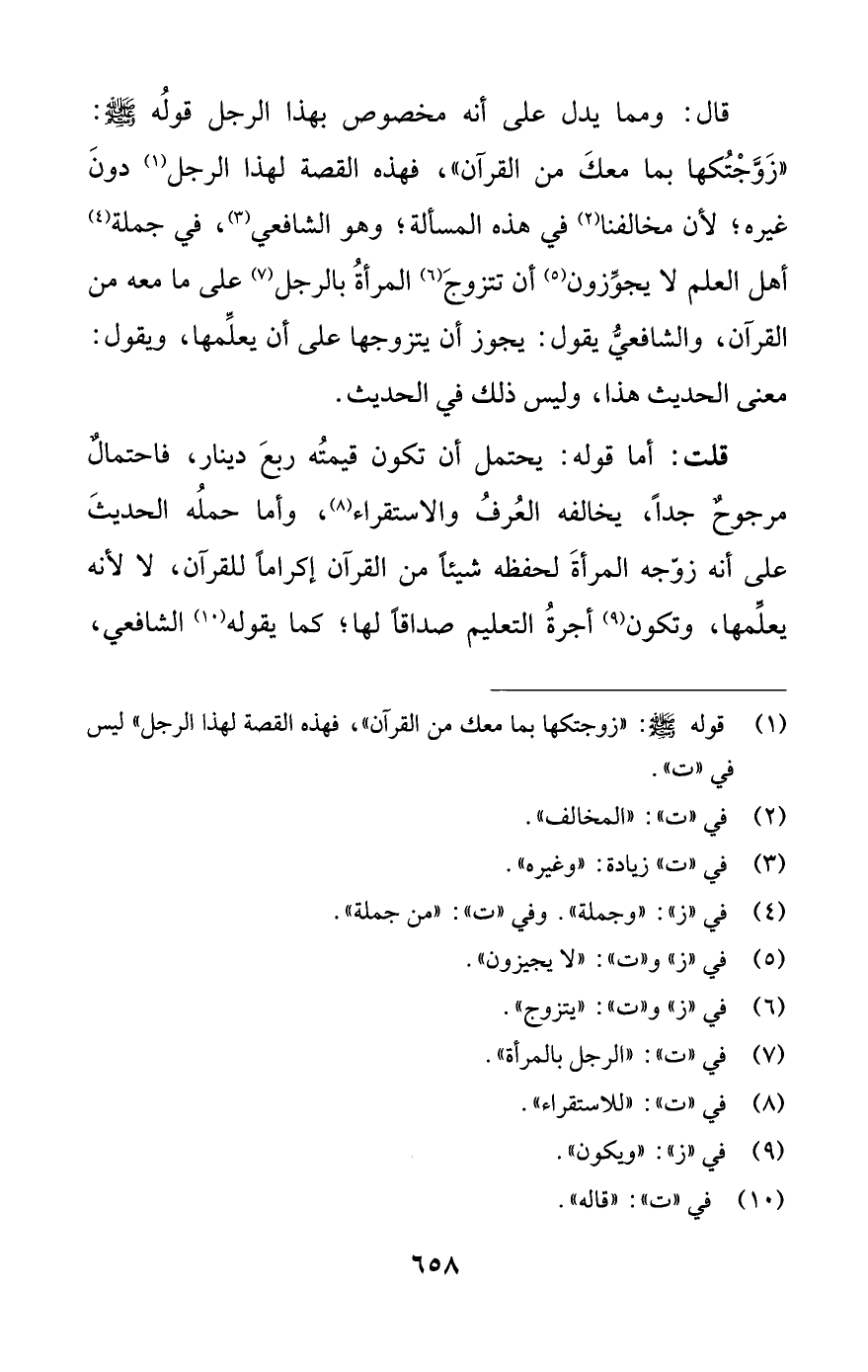 قلت: أما قوله: يحتمل أن تكون قيمتُه ربعَ دينار، فاحتمالٌ مرجوحٌ جدًا، يخالفه العُرفُ والاستقراء (¬8)، وأما حملُه الحديثَ على أنه زوّجه المرأةَ لحفظه شيئًا من القرآن إكرامًا للقرآن، لا لأنه يعلِّمها، وتكون (¬9) أجرةُ التعليم صداقًا لها؛ كما يقوله (¬10) الشافعي،