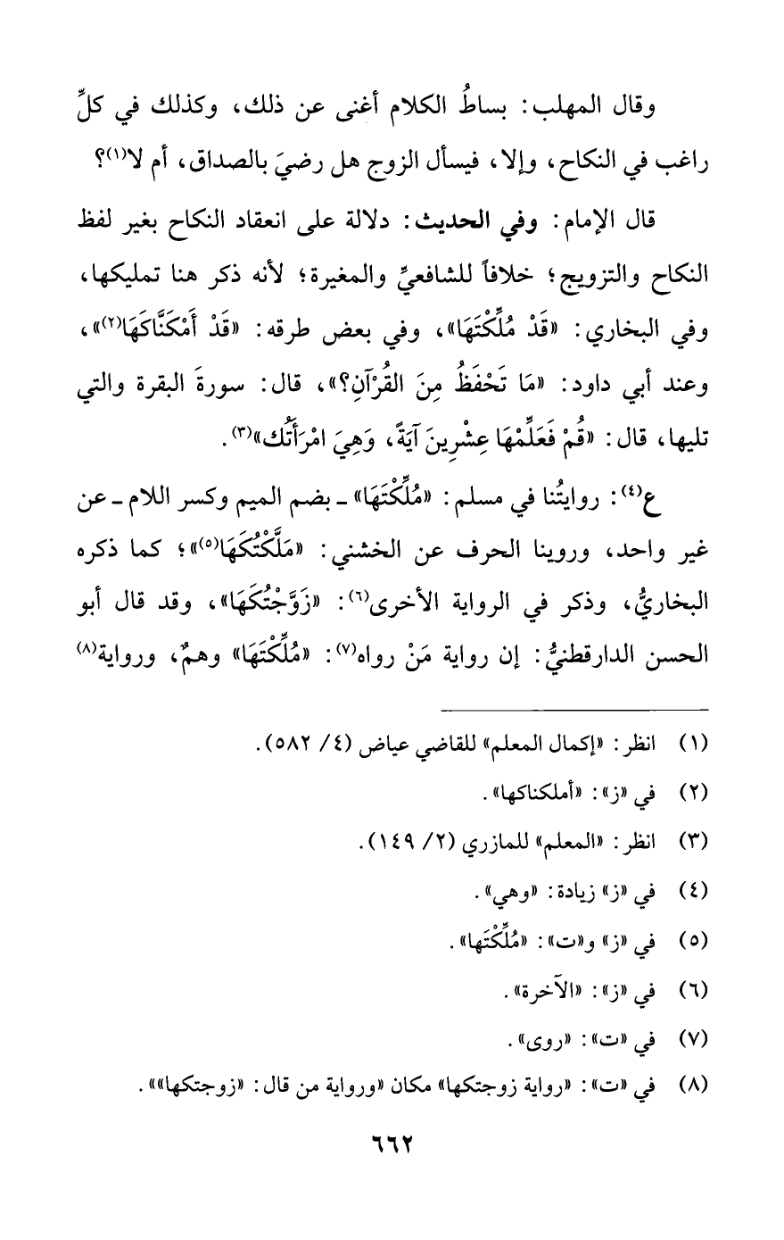 ع (¬4): روايتُنا في مسلم: "مُلِّكْتَهَا" -بضم الميم وكسر اللام- عن غير واحد، وروينا الحرف عن الخشني: "مَلَّكْتُكَهَا (¬5) "؛ كما ذكره البخاريُّ، وذكر في الرواية الأخرى (¬6): "زَوَّجْتُكَهَا"، وقد قال أبو الحسن الدارقطنيُّ: إن رواية مَنْ رواه (¬7): "مُلِّكْتَهَا" وهمٌ، ورواية (¬8)