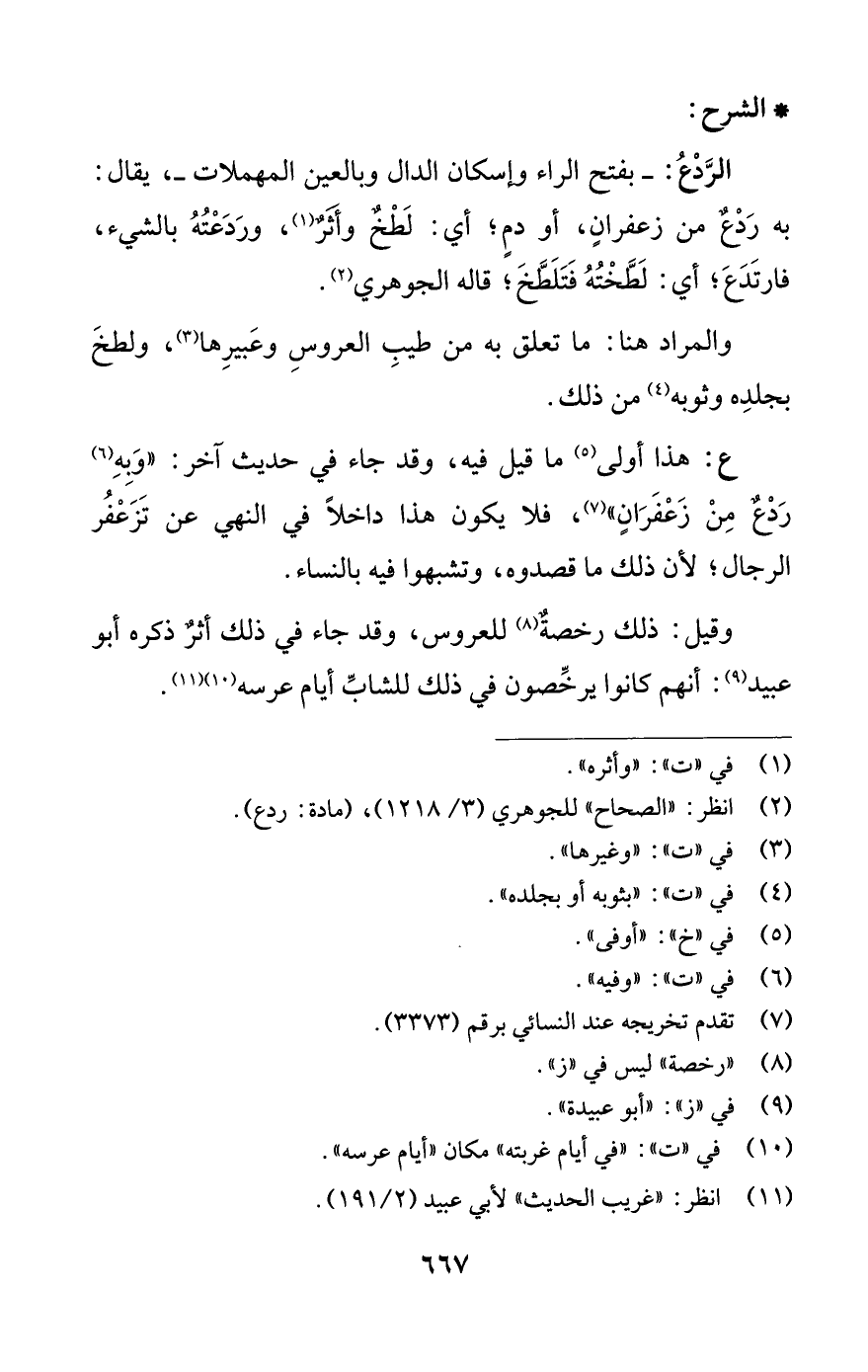 ع: هذا أولى (¬5) ما قيل فيه، وقد جاء في حديث آخر: "وَبِهِ (¬6) رَدْعٌ مِنْ زَعْفَرَان" (¬7)، فلا يكون هذا داخلًا في النهي عن تَزَعْفُر الرجال؛ لأن ذلك ما قصدوه، وتشبهوا فيه بالنساء.